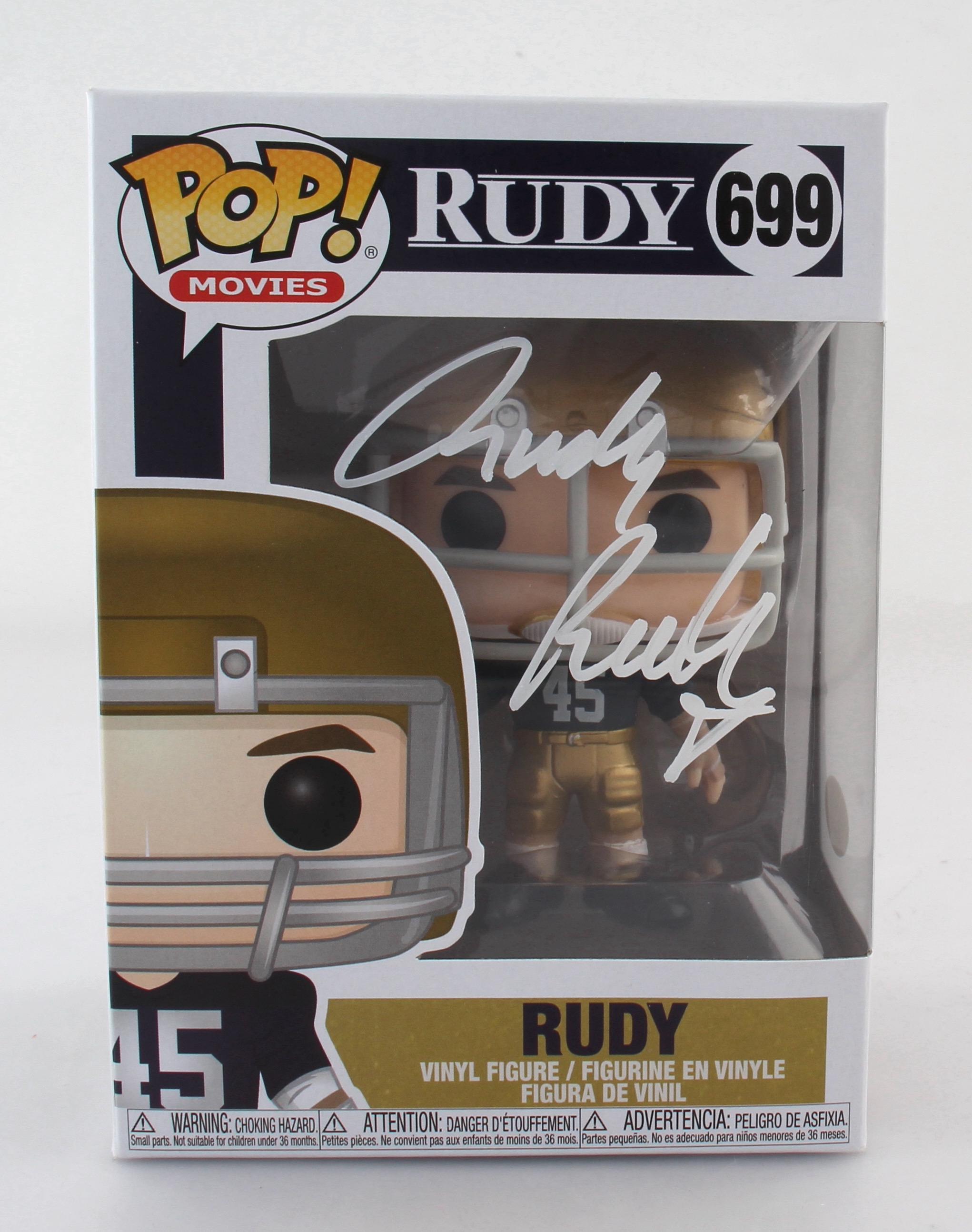 Funko Pop! figure measures approximately 4" tall and has been hand-signed on the packaging by Rudy Ruettiger.