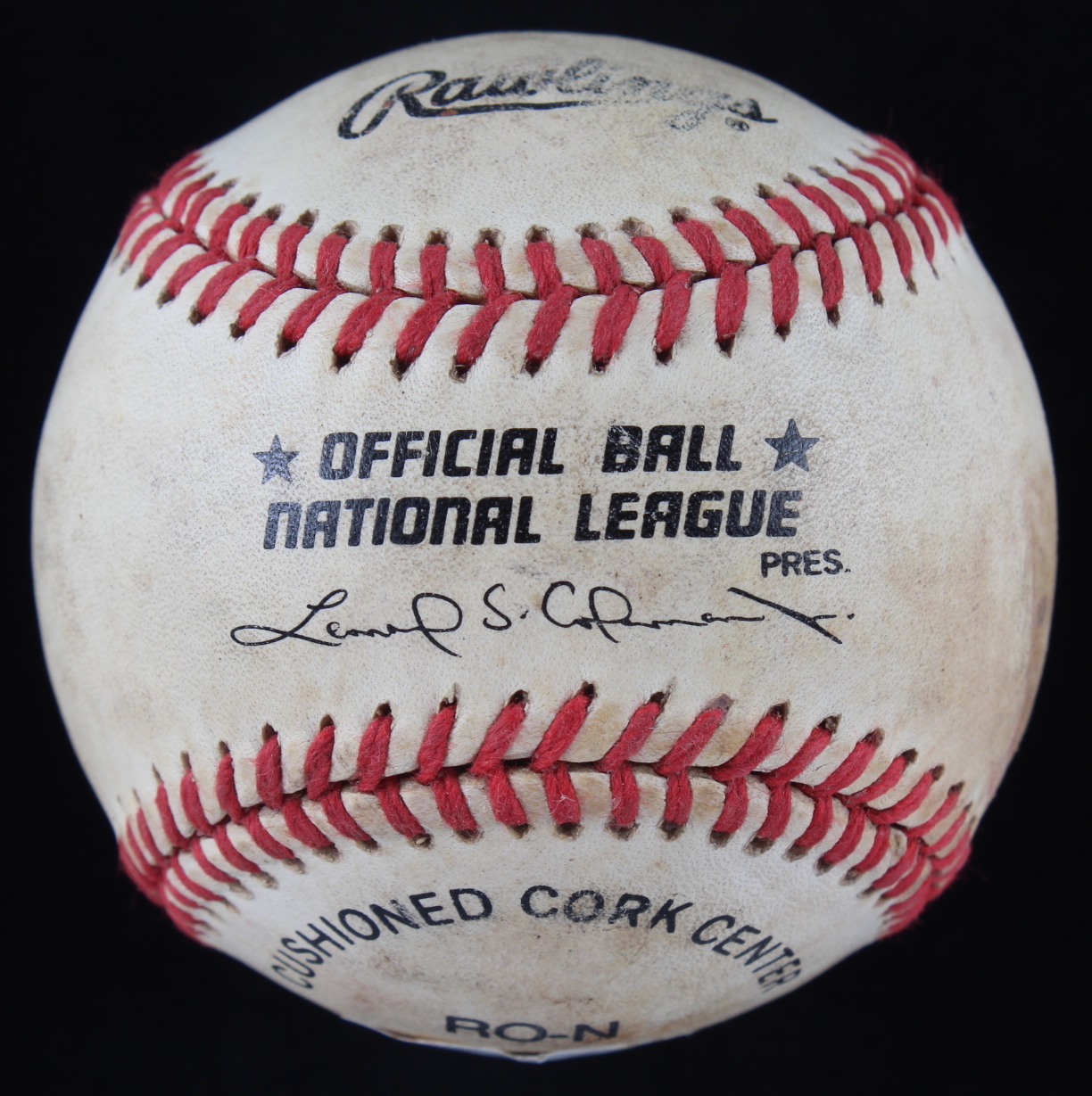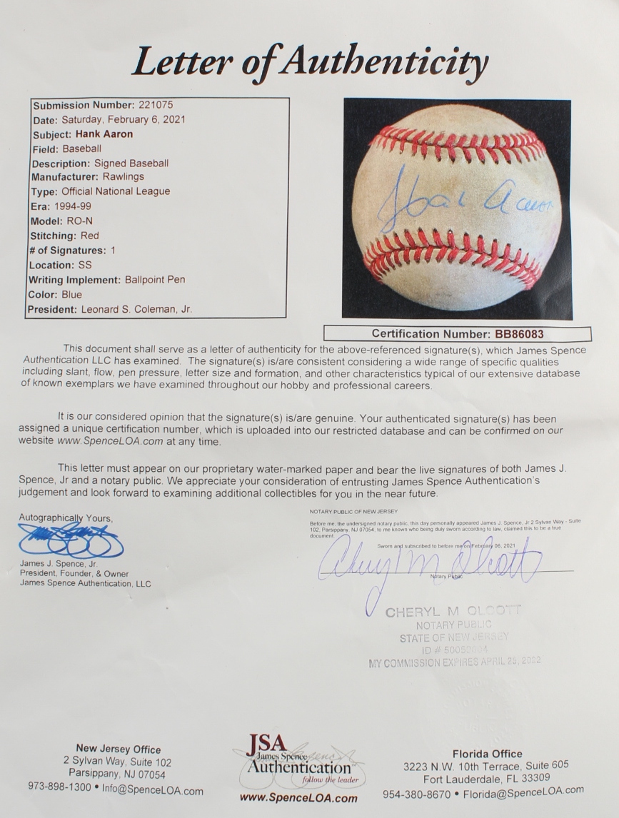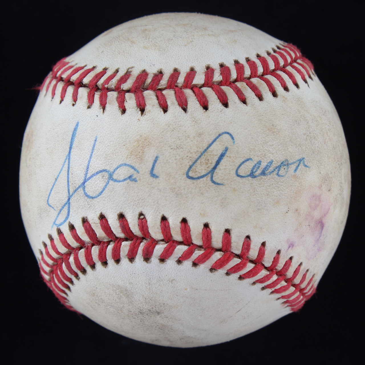 Rawlings Official National League baseball. Hand-signed by Hank Aaron (D. 2021, Atlanta Braves, HOF). Please note, the baseball shows signs of natural toning.