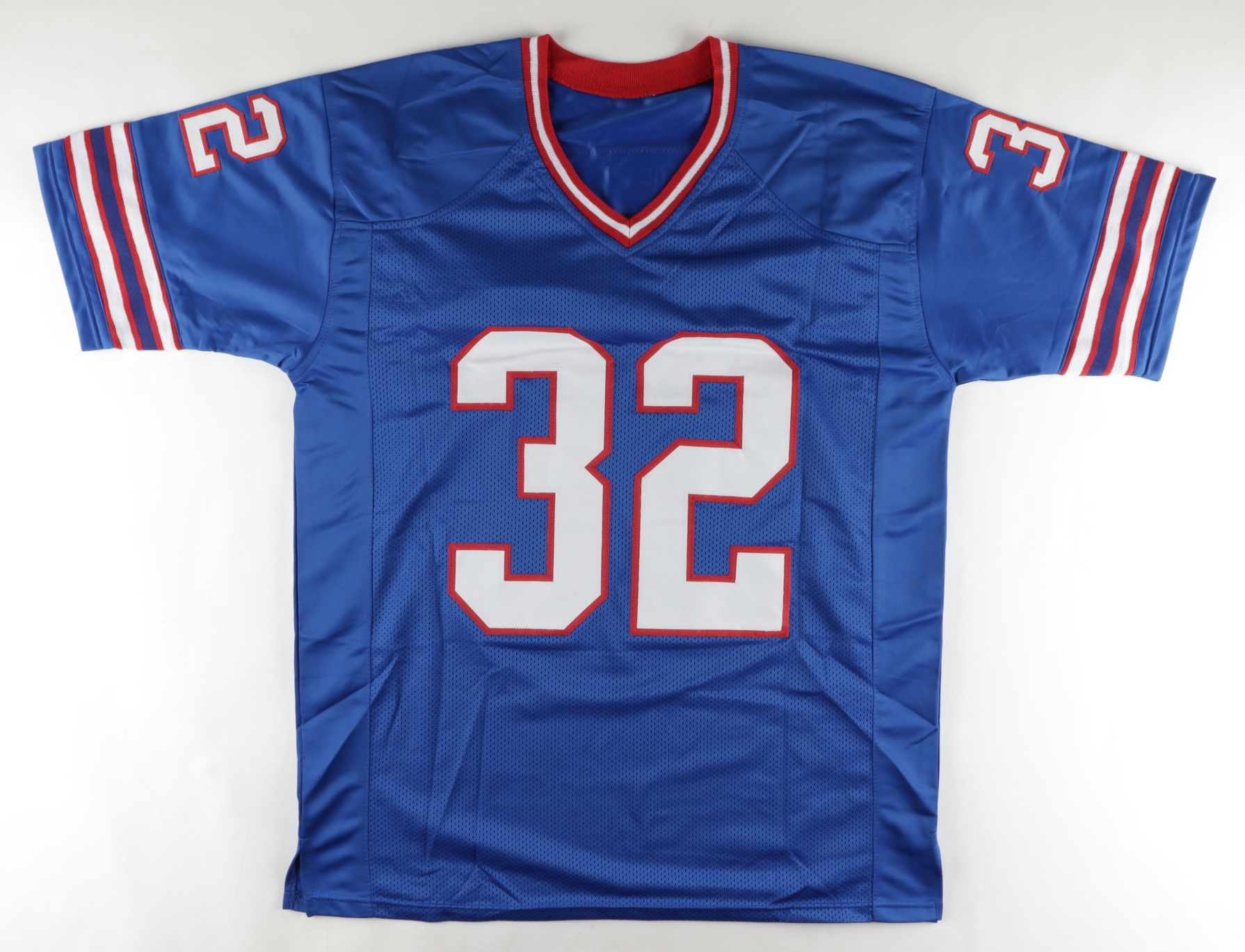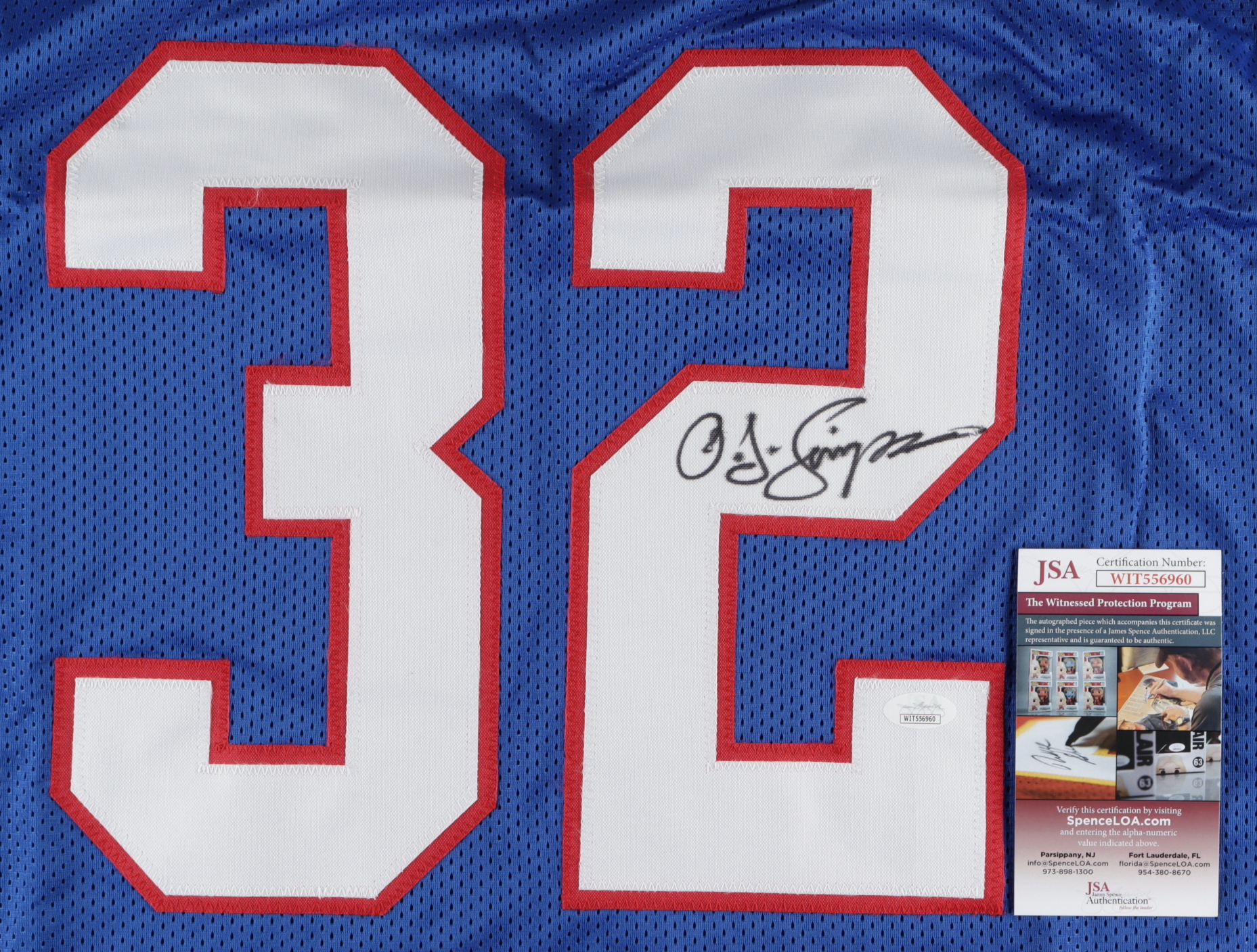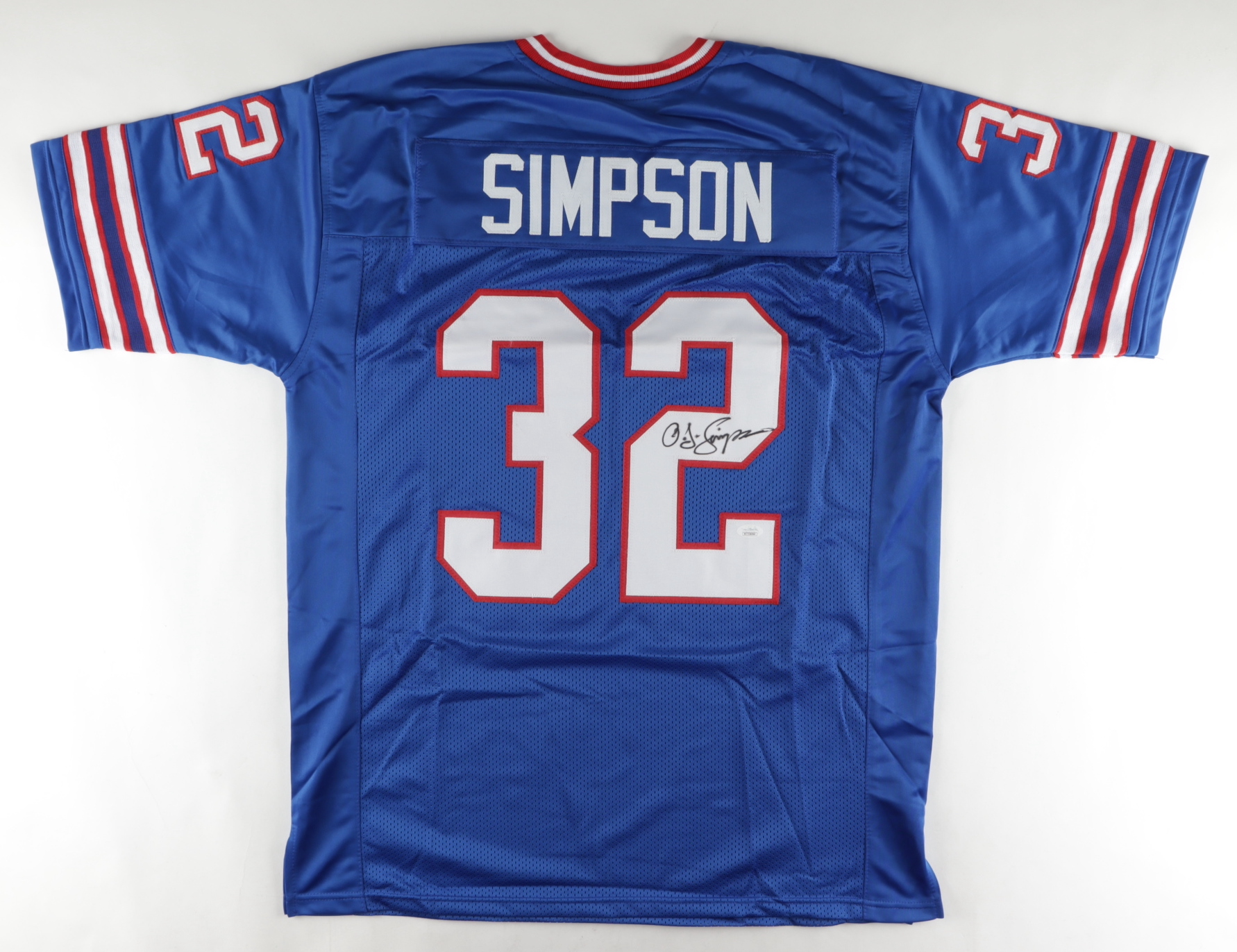 Custom on-field style jersey. Everything is sewn on, size XL. Has been hand-signed by O. J. Simpson (HOF).