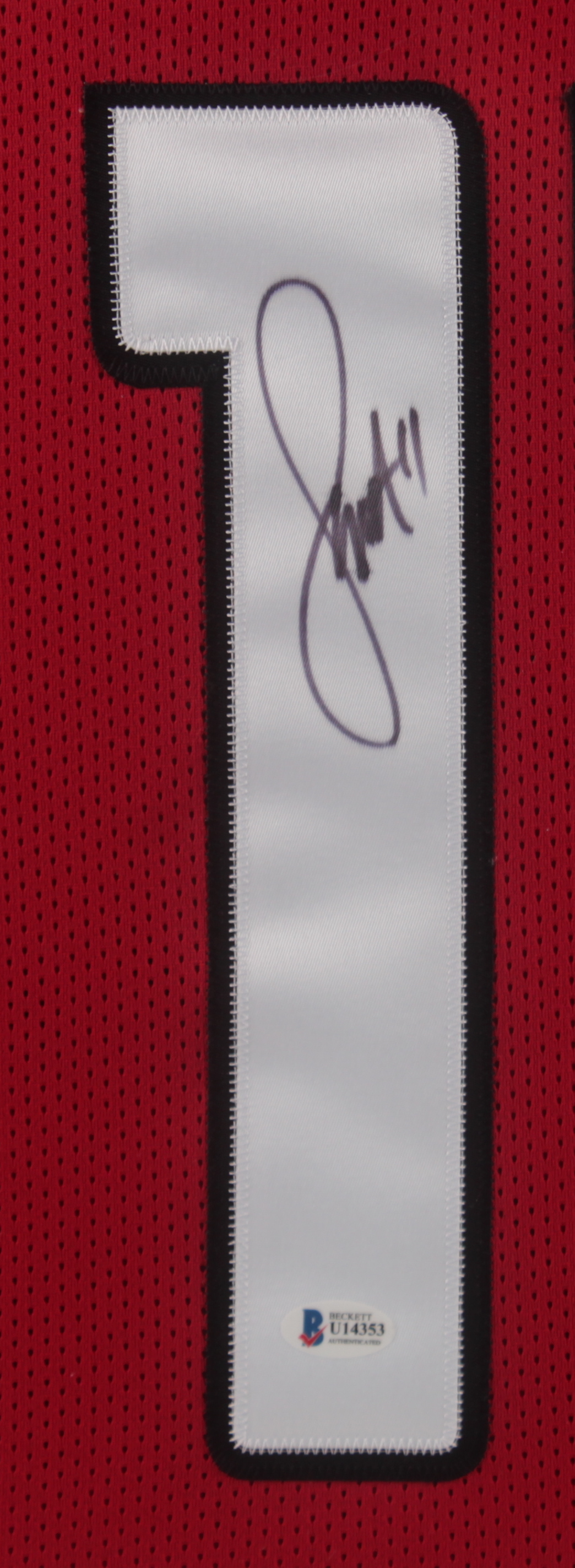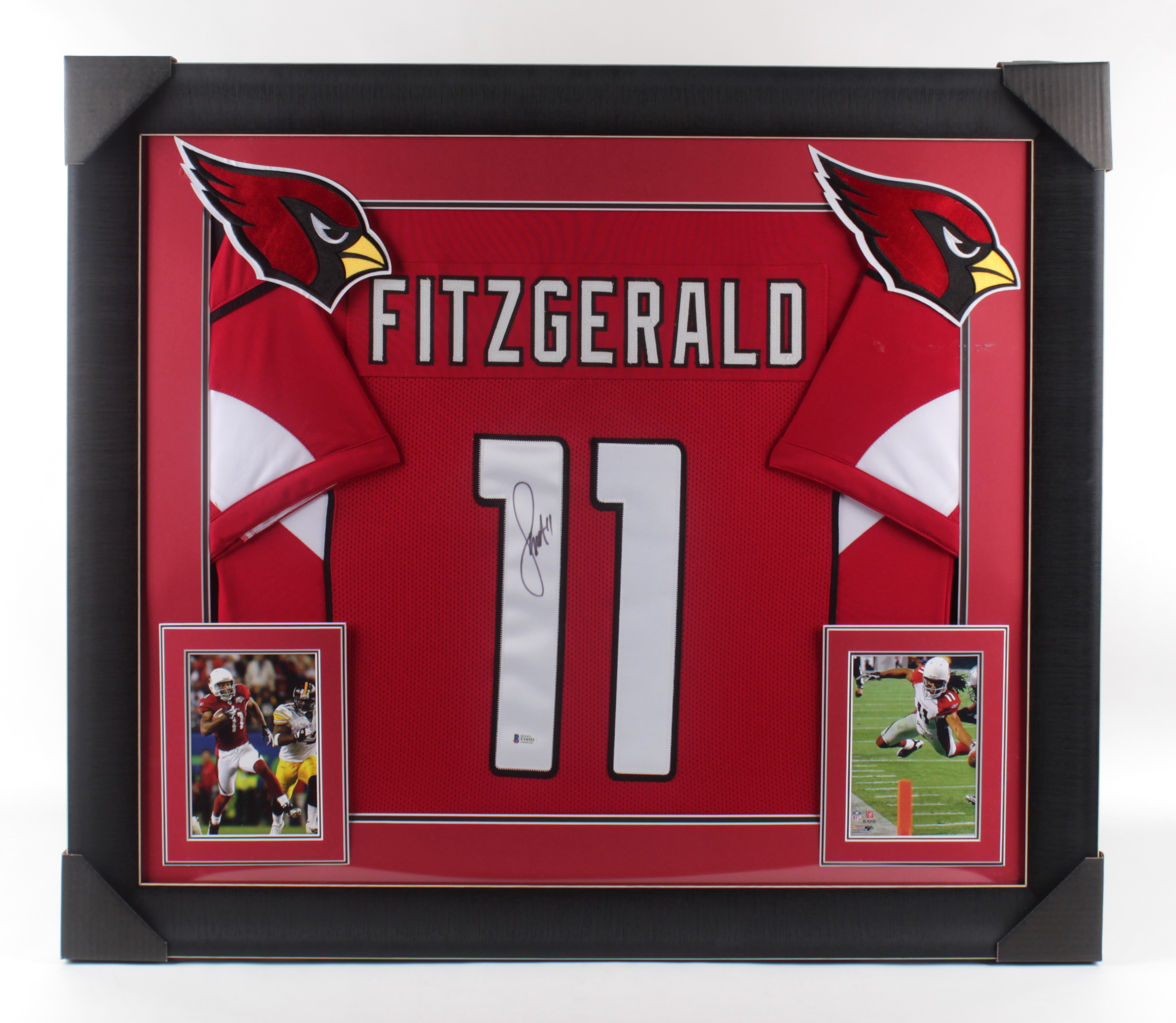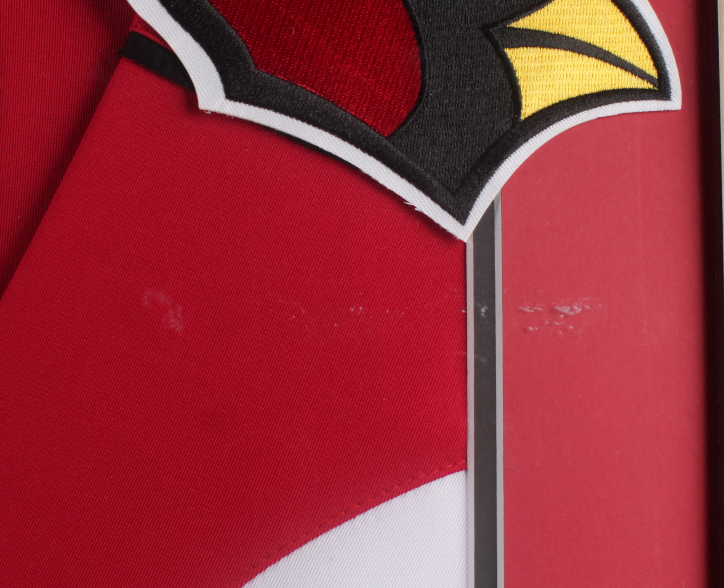 Custom frame measures approximately 32" x 36" in size and features a jersey hand-signed by Larry Fitzgerald. Please note, there is residue on the glass of the display.