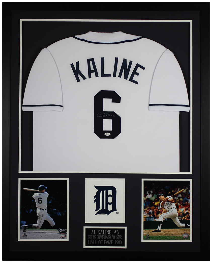 Custom frame measures approximately 35" x 43" in size and features a jersey hand-signed by Al Kaline (D. 2020, HOF).