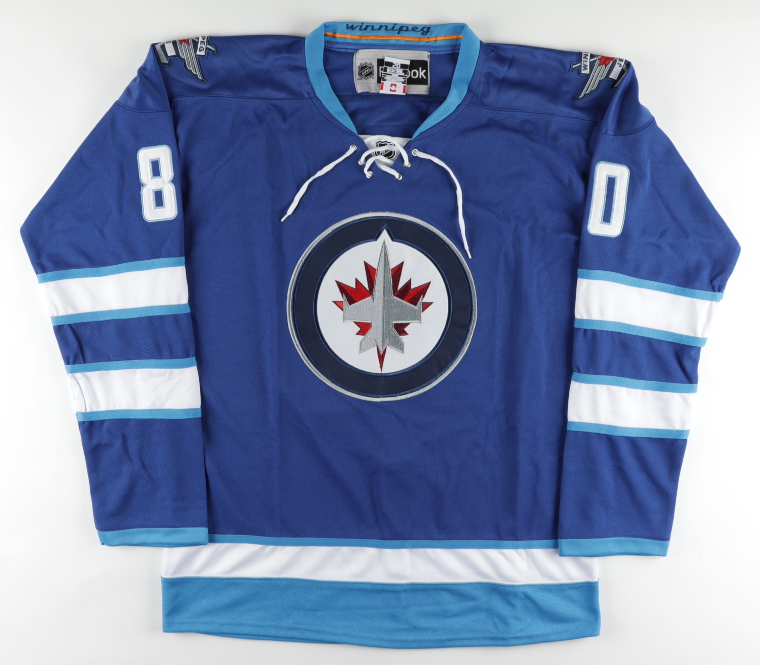 Reebok on-ice style jersey. Everything is sewn on, size (50). Hand-signed by Nik Antropov (Winnipeg Jets).