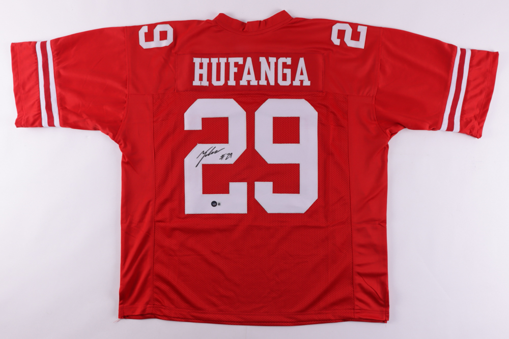 Custom jersey. Everything is sewn on, size XL. Hand-signed by Talanoa Hufanga.