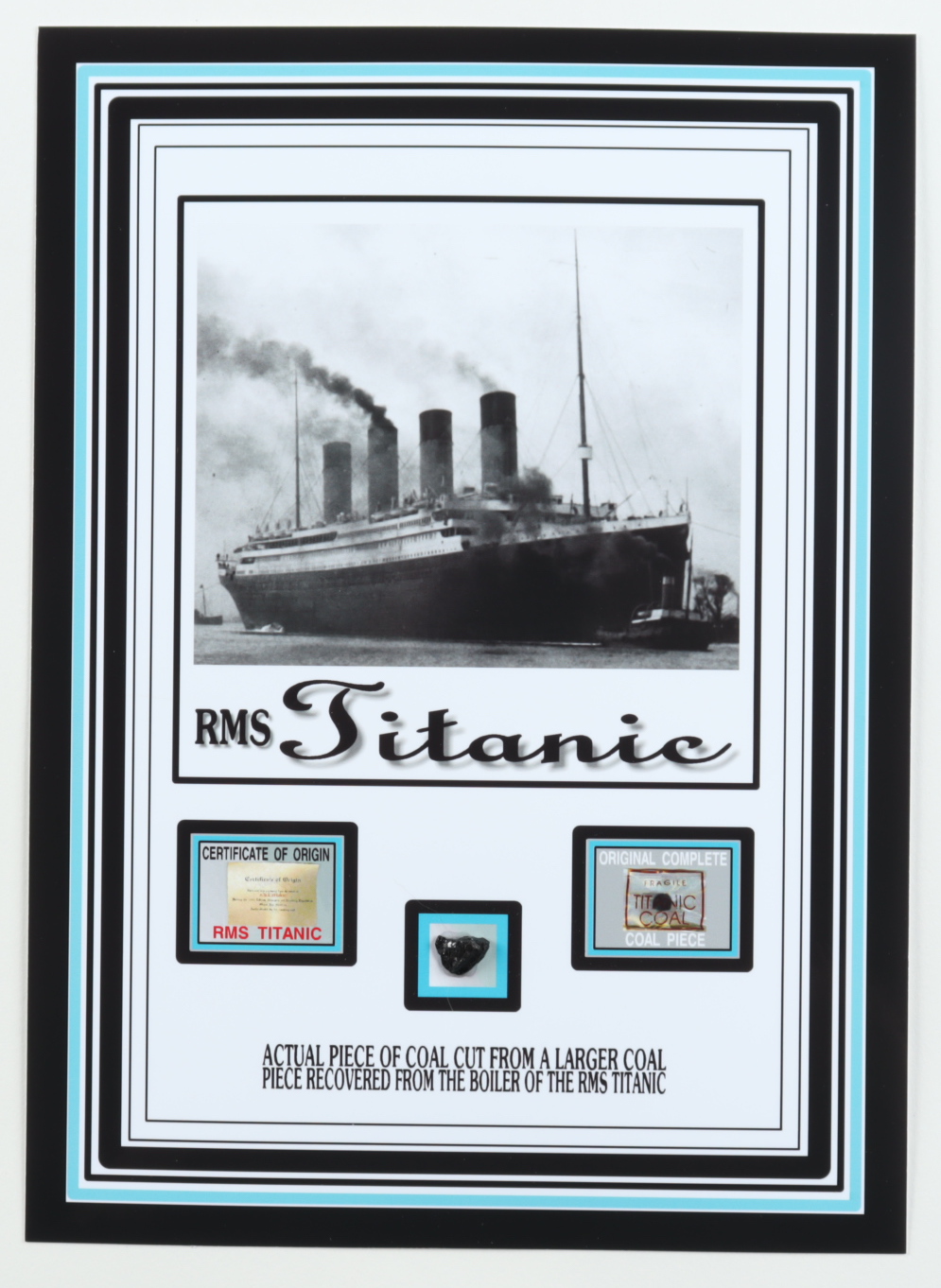 Photo measures approximately 6" x 8" in size and features a piece of coal recovered from the Titanic. Please note, the coal has been glued onto the photo. RMS Titanic was a British passenger liner that sank in the North Atlantic Ocean in 1912 after the ship struck an iceberg during her maiden voyage from Southampton to New York City. Of the estimated 2,224 passengers and crew aboard, more than 1,500 died, making it one of modern history's deadliest peacetime commercial marine disasters. RMS Titanic was the largest ship afloat at the time she entered service.