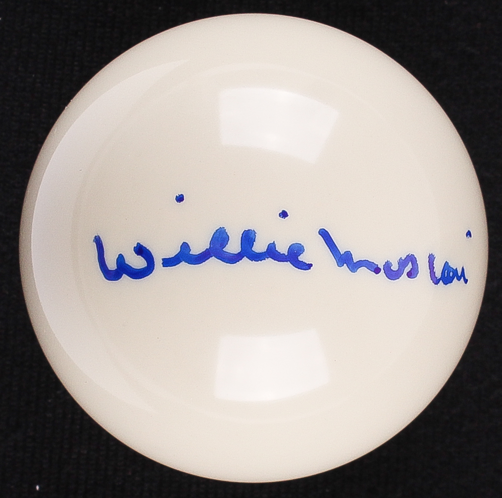 Cue Ball has been hand-signed in blue felt-tip pen by billiards legend Willie Mosconi (D. 1993).