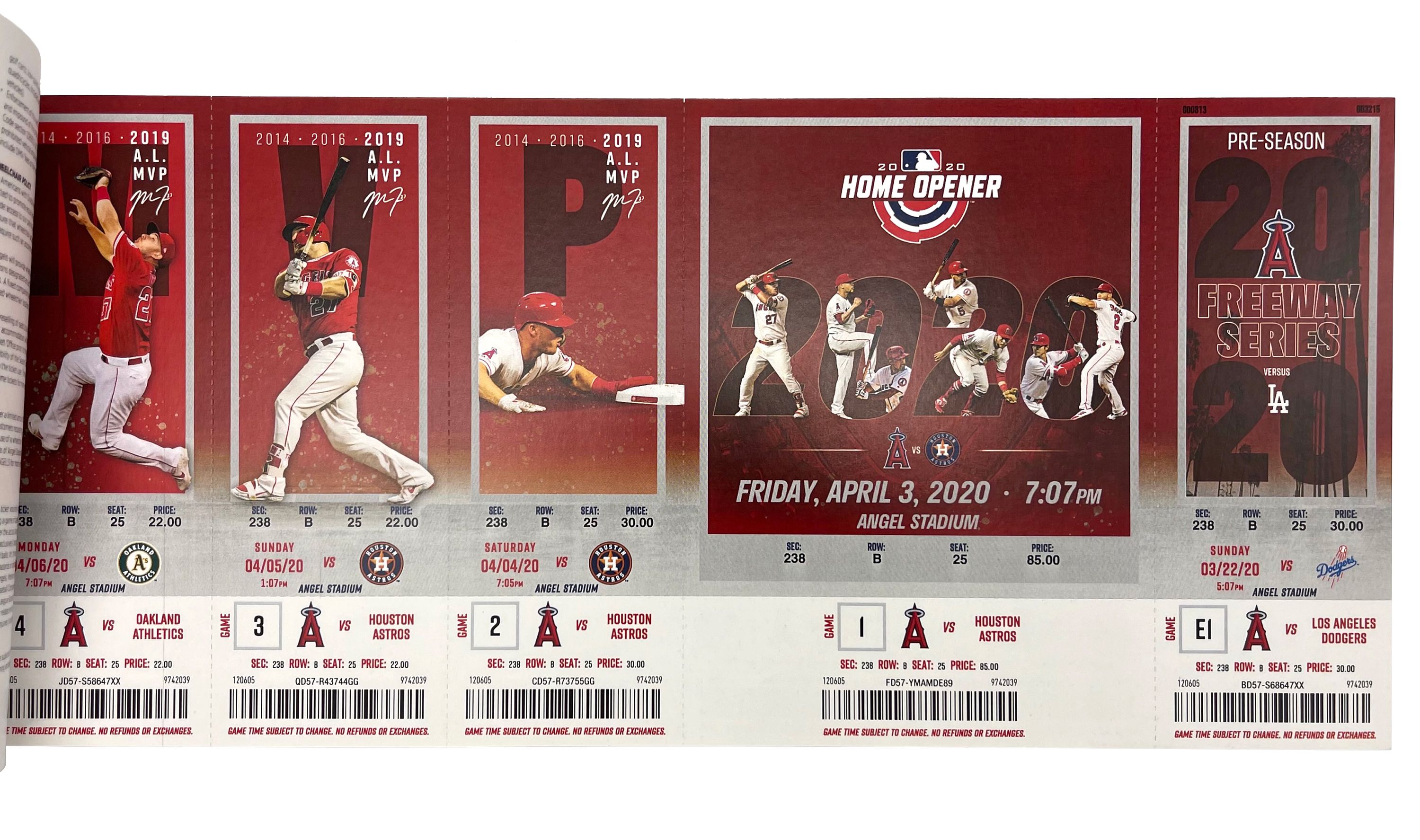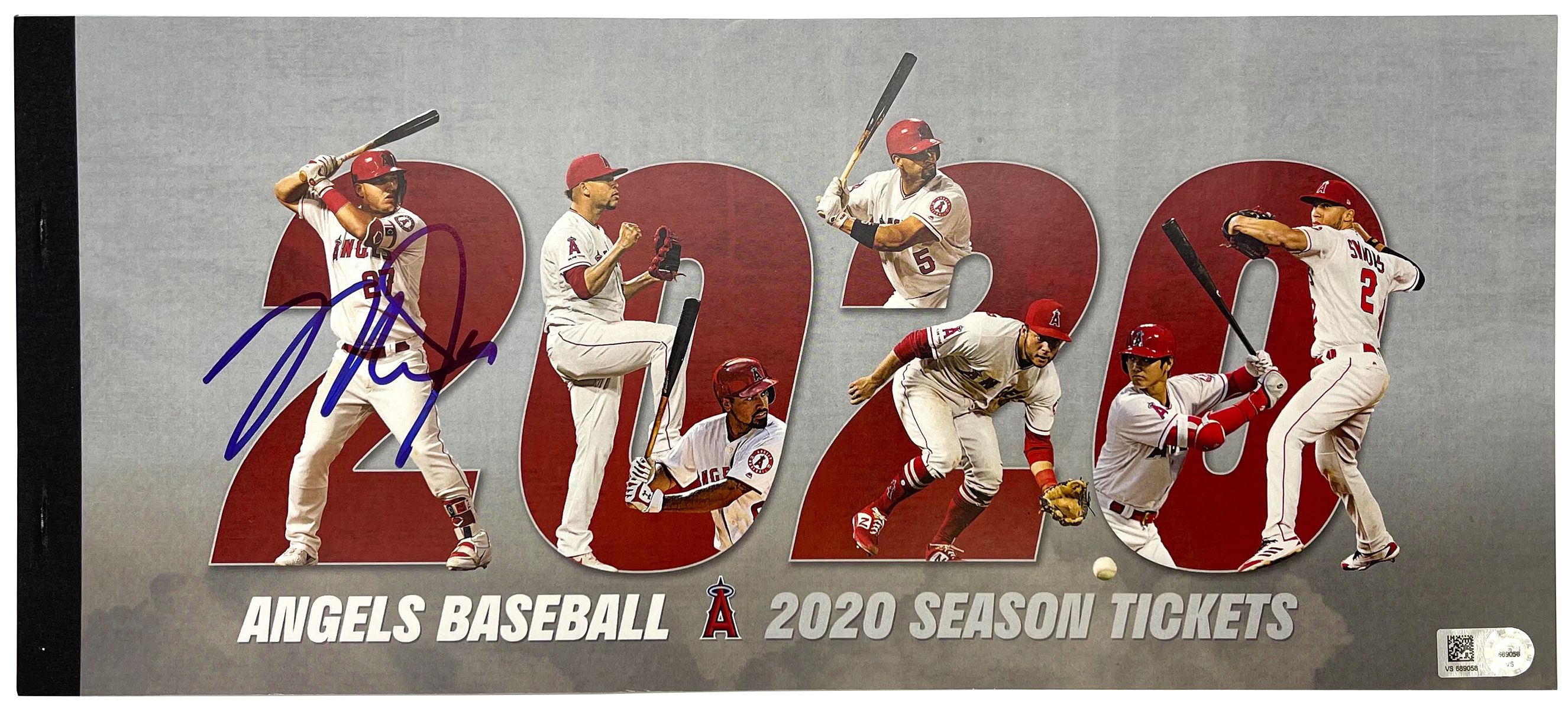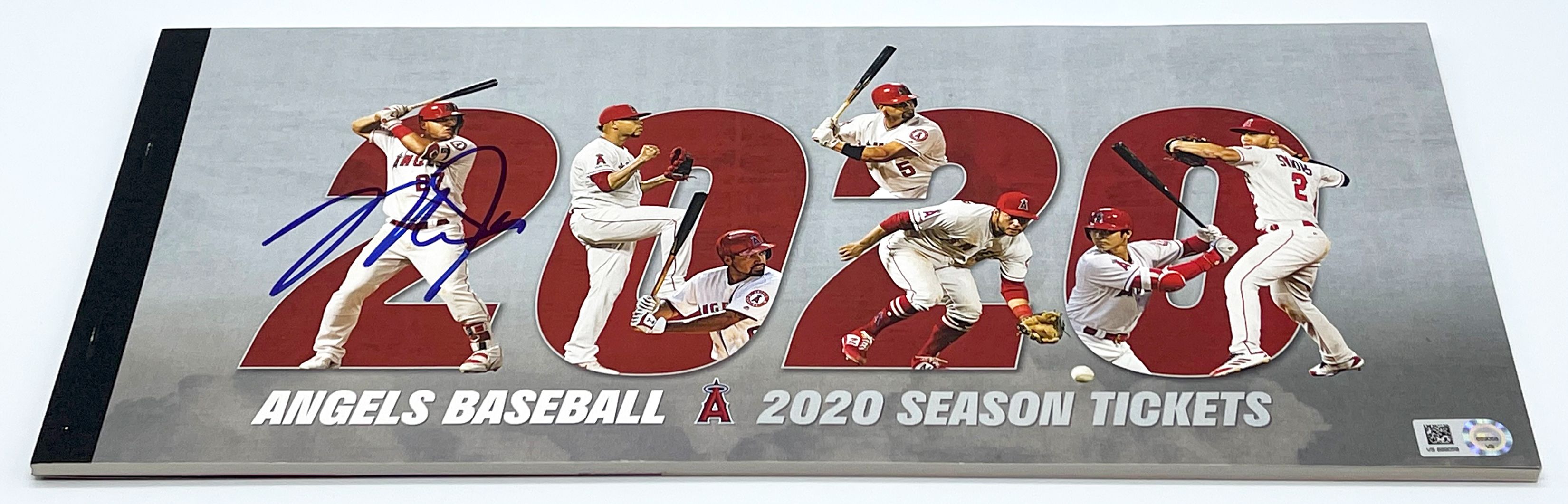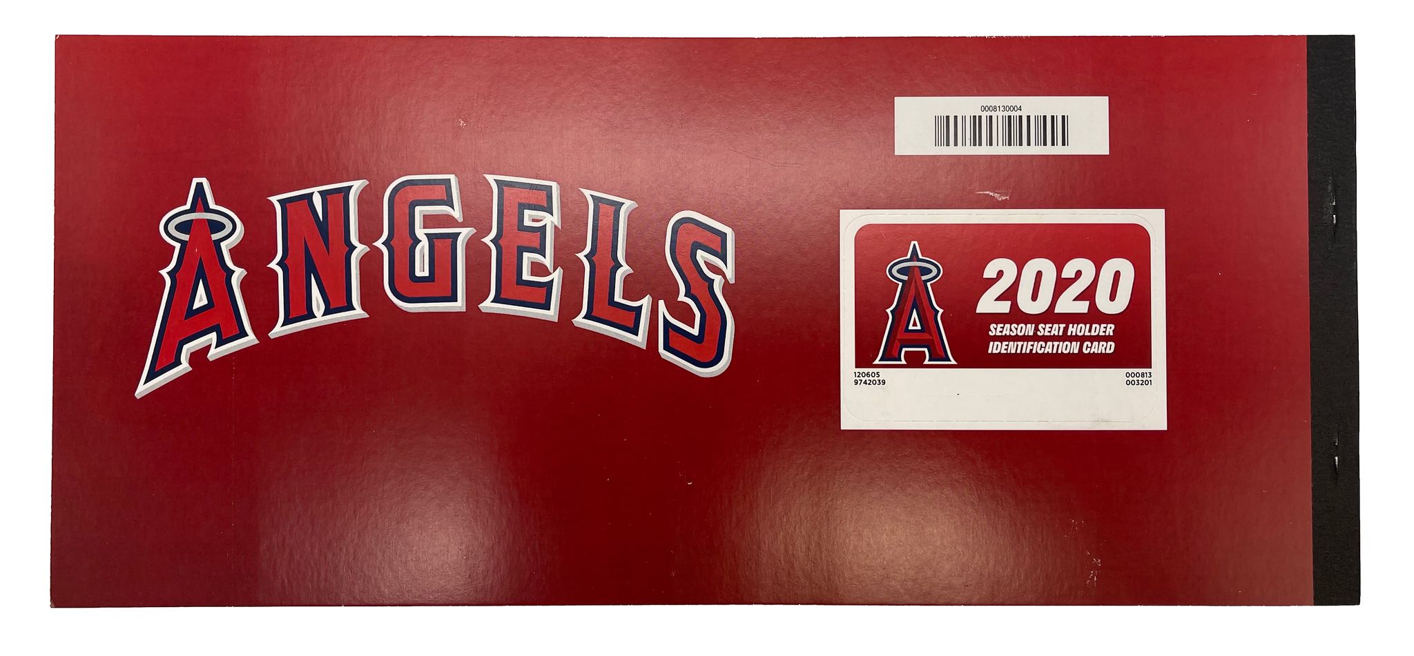 2020 Angels Stadium Season Ticket Book. Hand-signed by Mike Trout (Los Angeles Angels). Full season ticket book for all 81 tickets in the 2020 season before it was shortened due to the Pandemic. Includes the original ticket from September 5, 2020 where Mike Trout hit his 300th Home Run setting an Angel's Club record for HR's.