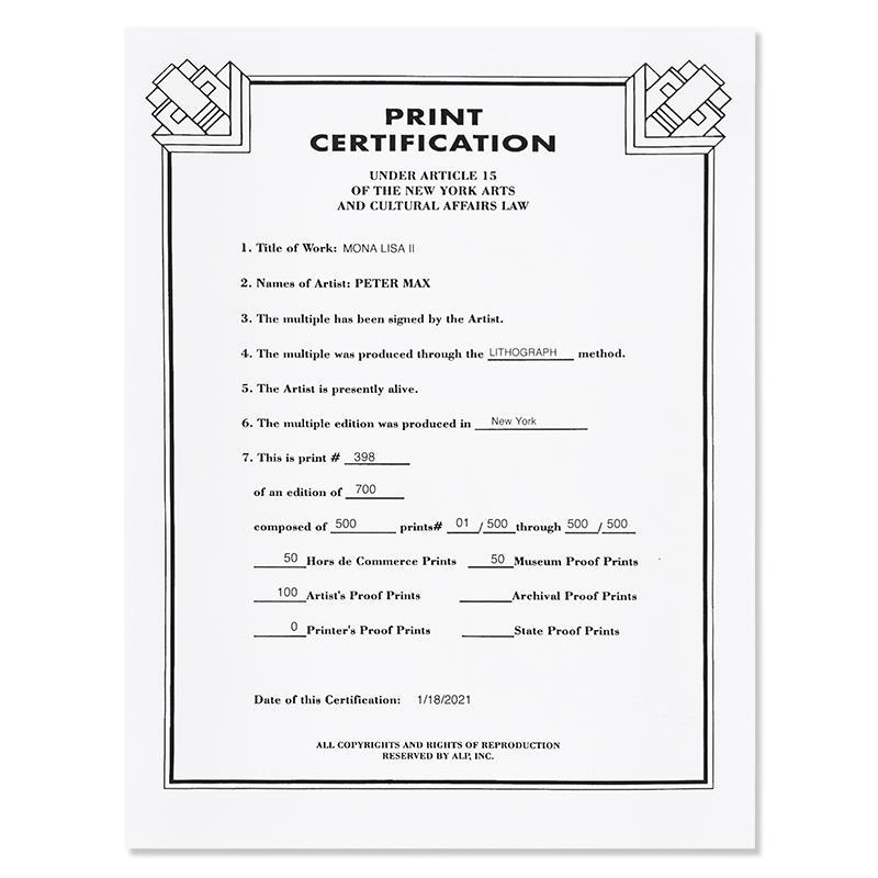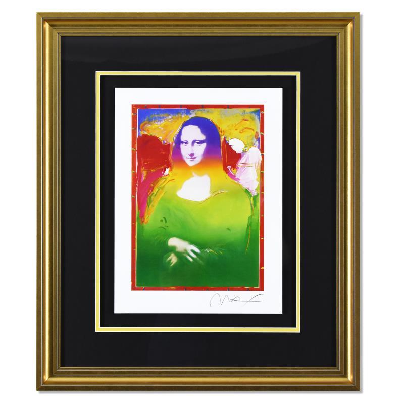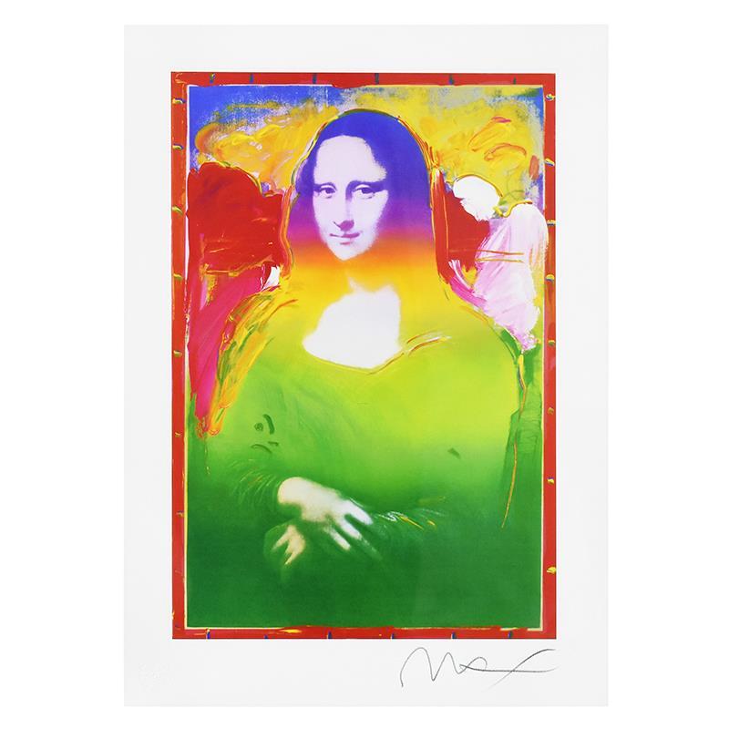 "Mona Lisa II" is a limited edition lithograph on paper by Peter Max, numbered 398/500 and hand signed by the artist. This piece comes framed and includes Certificate of Authenticity from Peter Max Studios. Measures approximately 27" x 23 (frame), 16" x 12" (image).