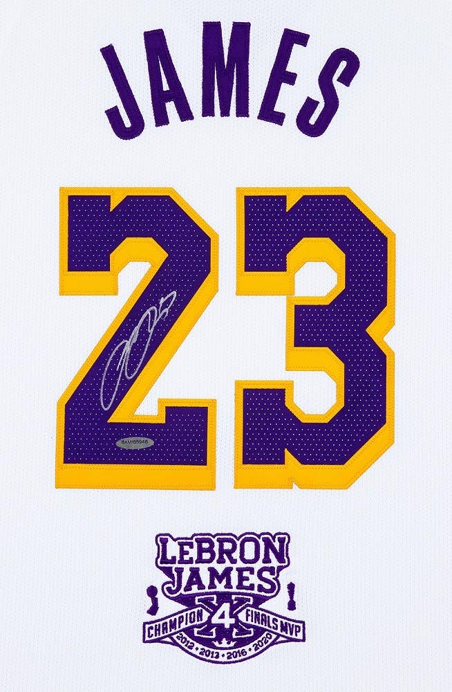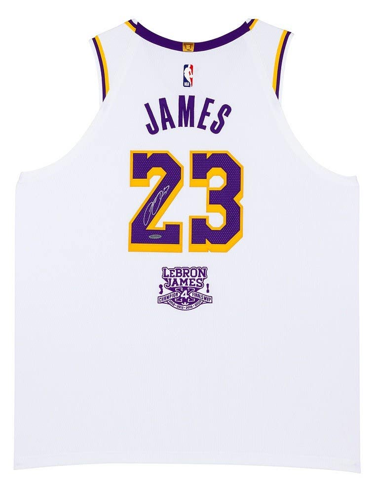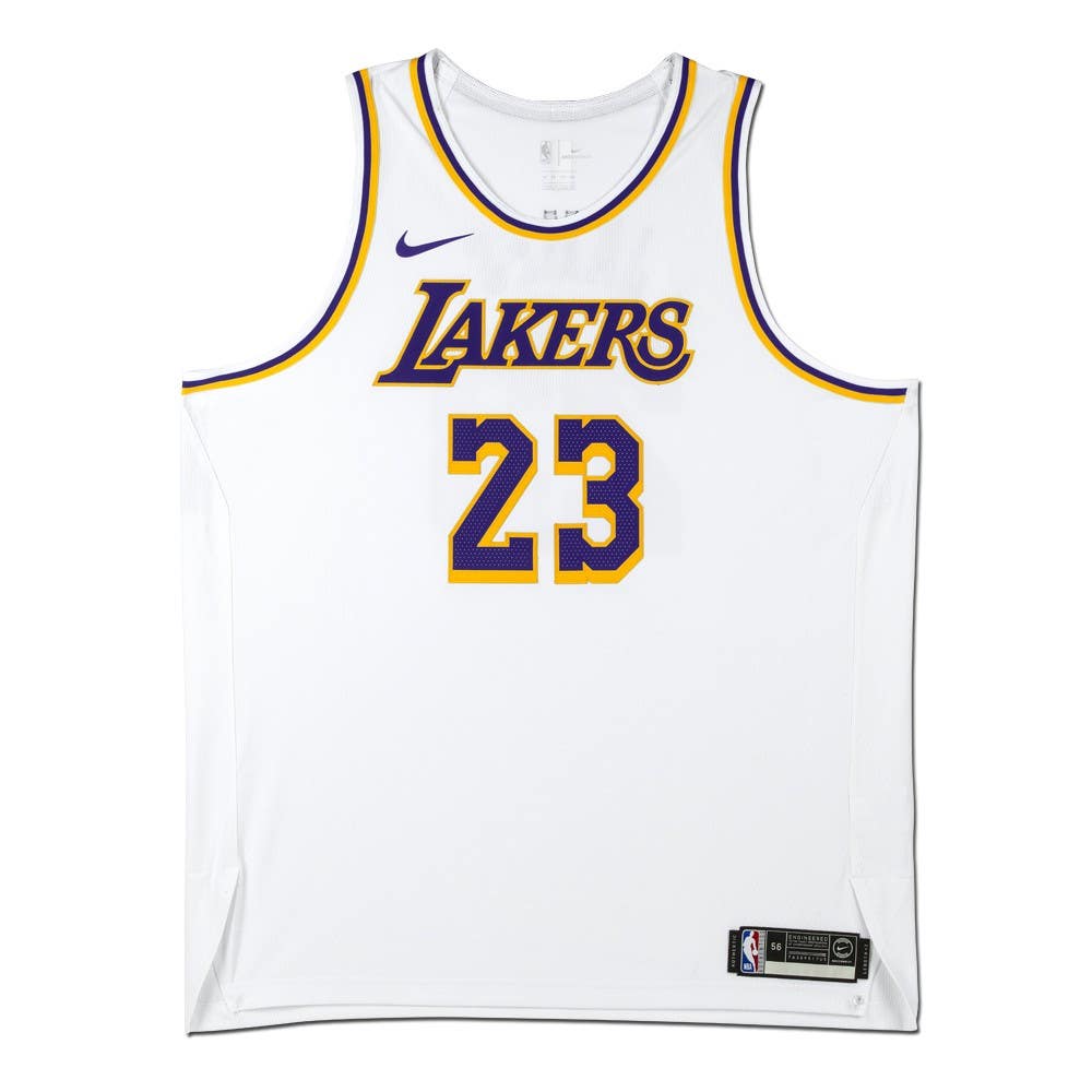 Nike authentic on-court jersey. Everything is sewn on, size (56). Hand-signed by LeBron James (Los Angeles Lakers).
