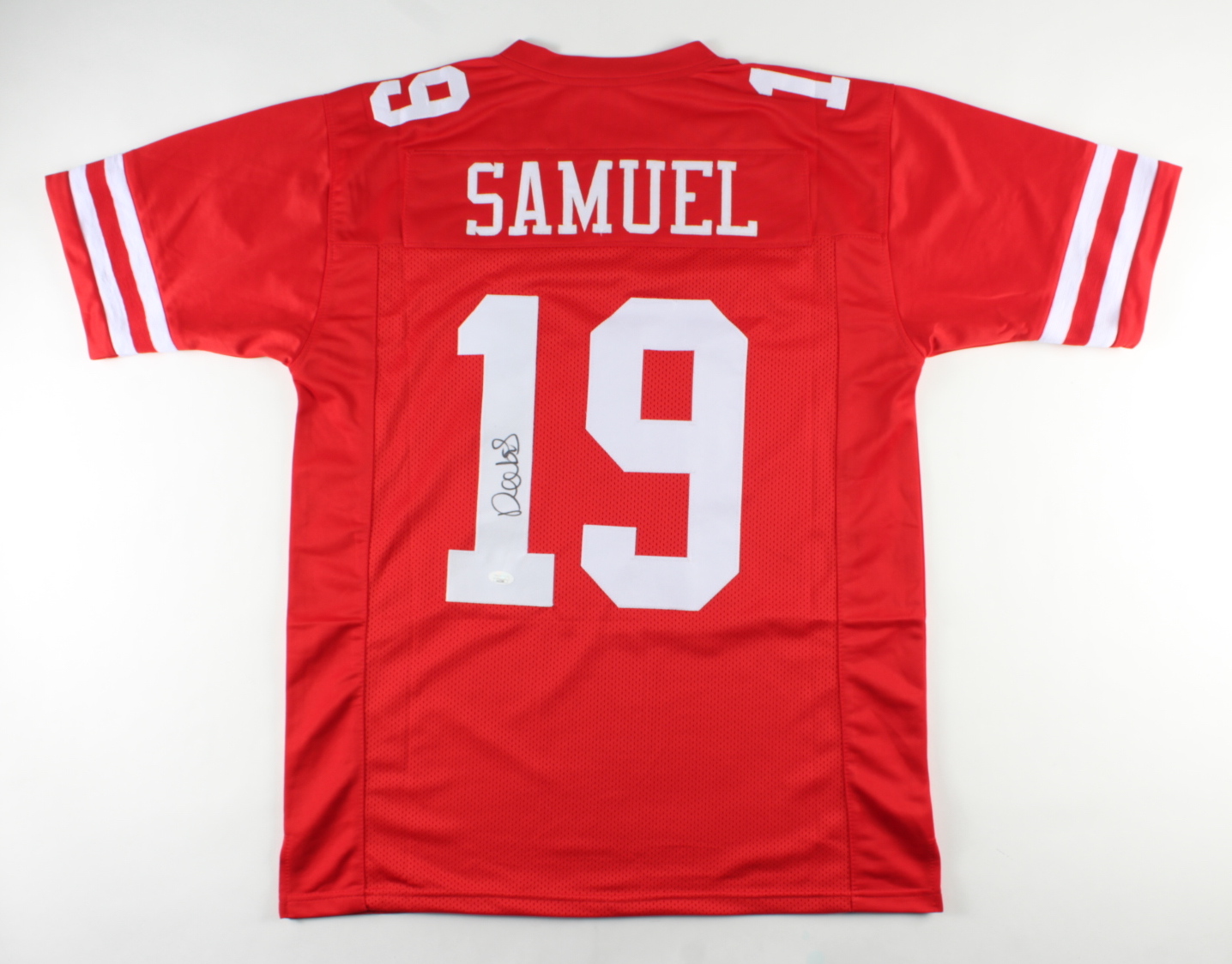 Custom on-field style jersey. Everything sewn on, size XL. Hand-signed by Deebo Samuel.