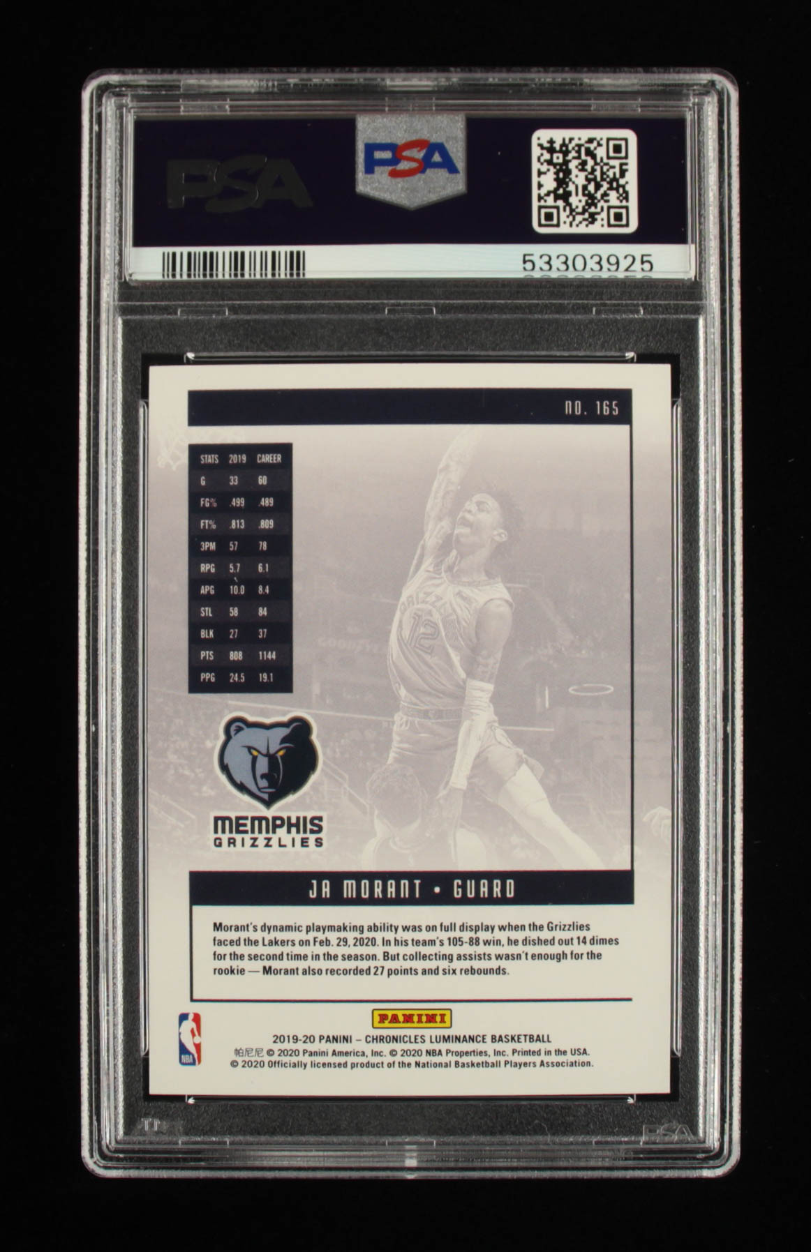 Ja Morant 2019-20 Panini Chronicles #165 Luminance (PSA 9)