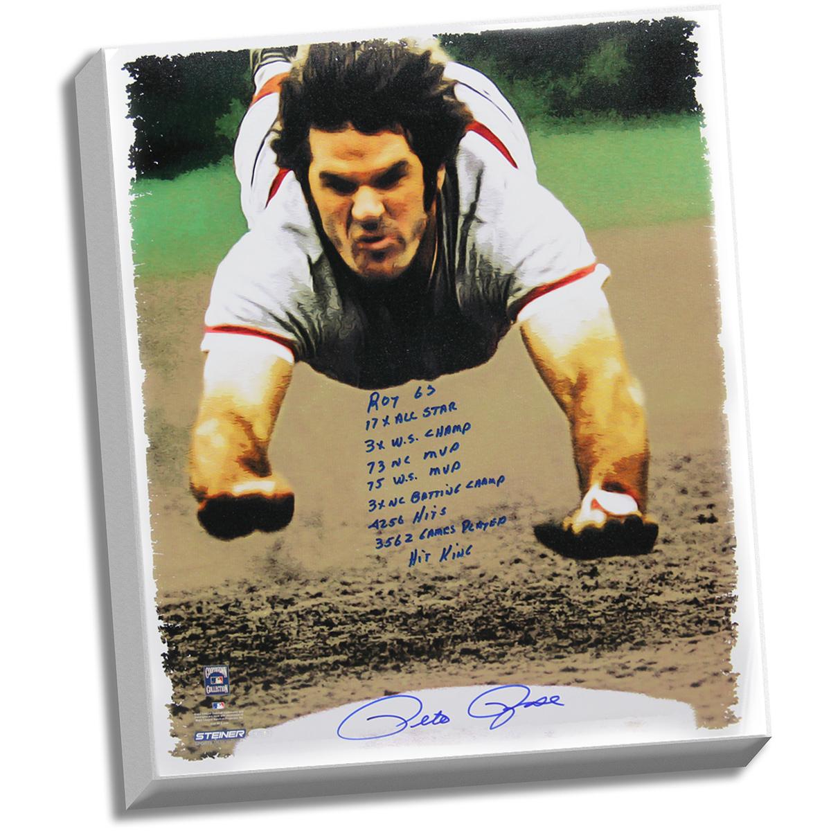 Canvas measures 28" x 35" in size and has been hand-signed and inscribed in blue felt-tip pen by Pete Rose. Inscriptions include "ROY 65, 17x All-Star, 3x WS Champ, 73 NL MVP, 75 WS MVP, 3x NL Batting Champ, 4256 Hits, 3562 Games Played & Hit King".