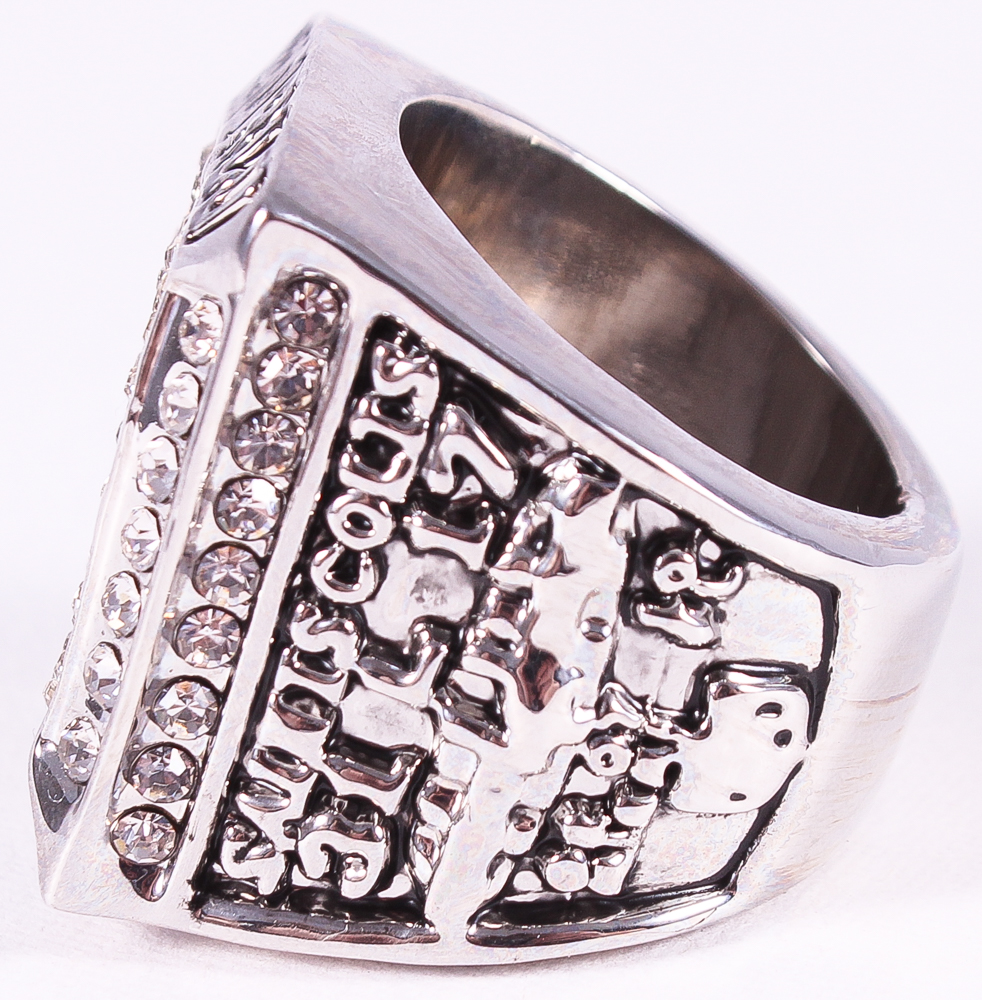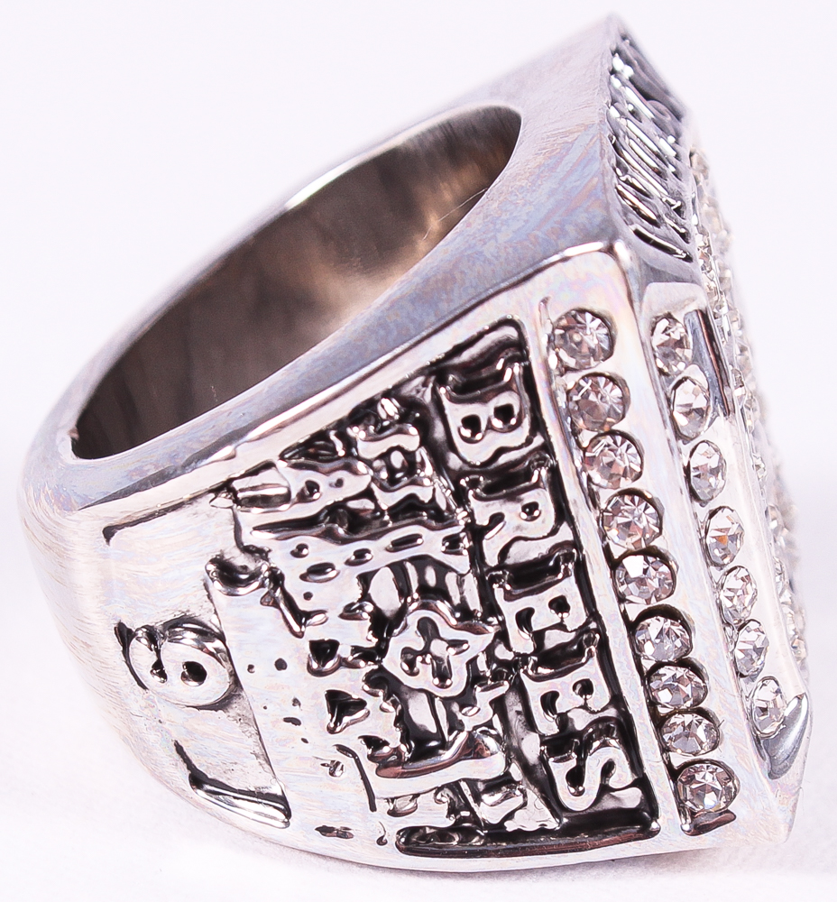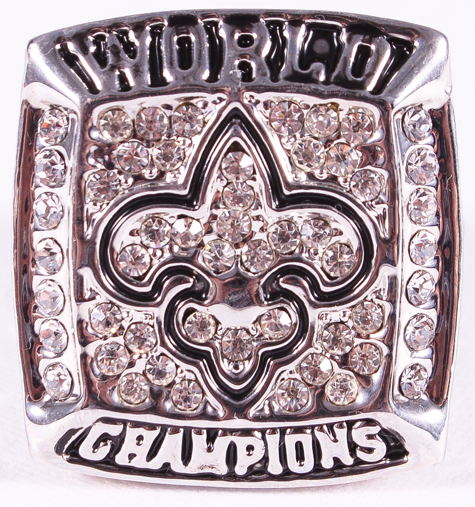 Drew Brees Saints High Quality Replica 2009 Super Bowl XLIV champions Ring. The ring has been hand crafted by professional jewelers. Made of metal alloy and clad with silver. Size 11.