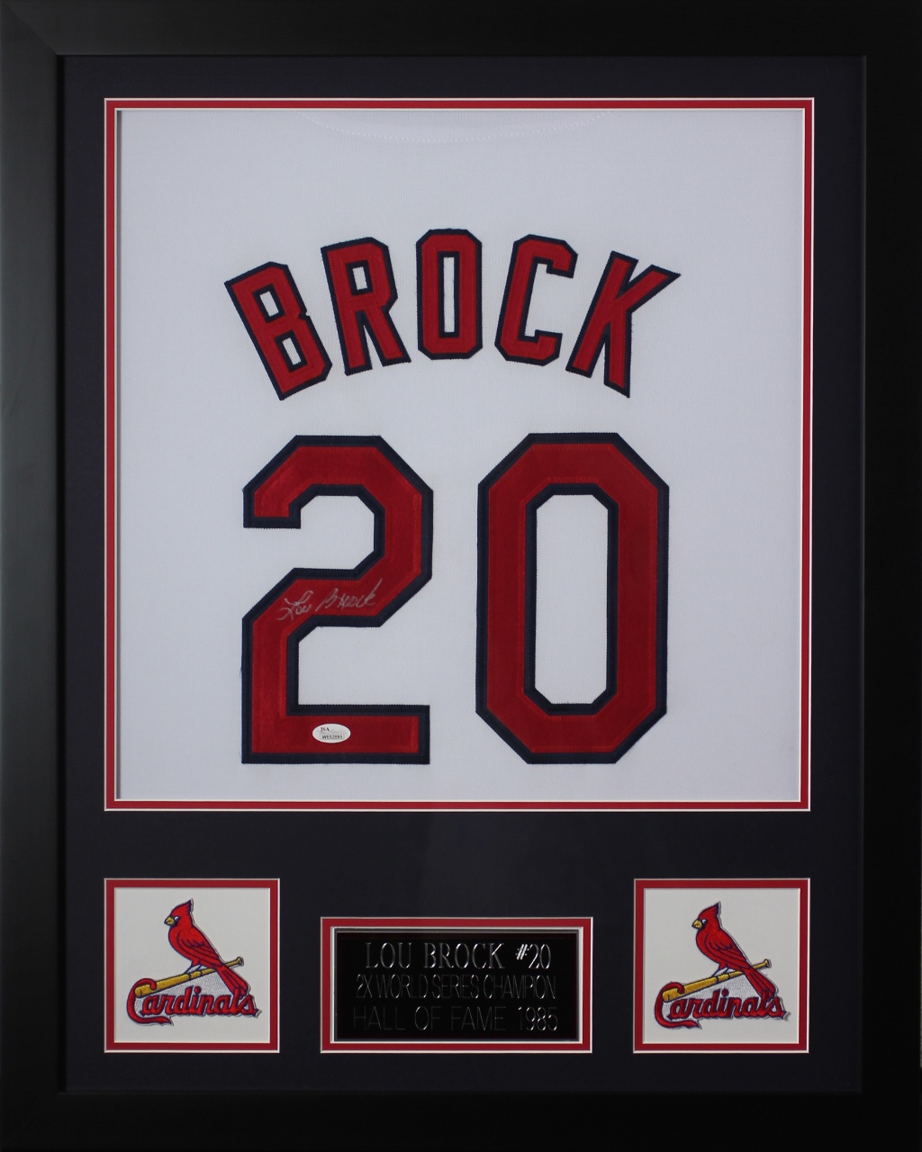 A beautifully framed autographed Lou Brock Cardinals Jersey. The autograph was certified by JSA and includes a sticker on the Jersey and a matching certificate attached to the back of the frame.