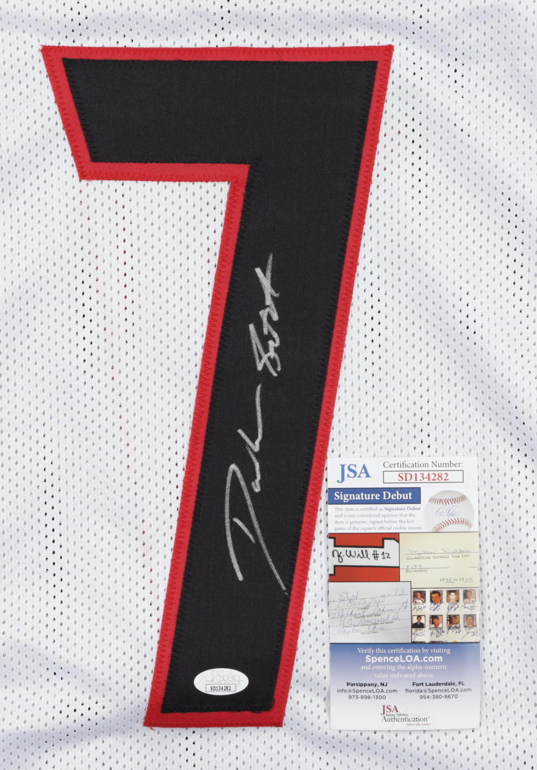 The autograph(s) includes an official James Spence Authentication (JSA) "Signature Debut" hologram and COA. "Signature Debut" is the autographed memorabilia equivalent to a rookie card. The JSA definition of a "Signature Debut" is as follows: "Any item that is autographed and received by JSA prior to the last game of the signer's official rookie season.