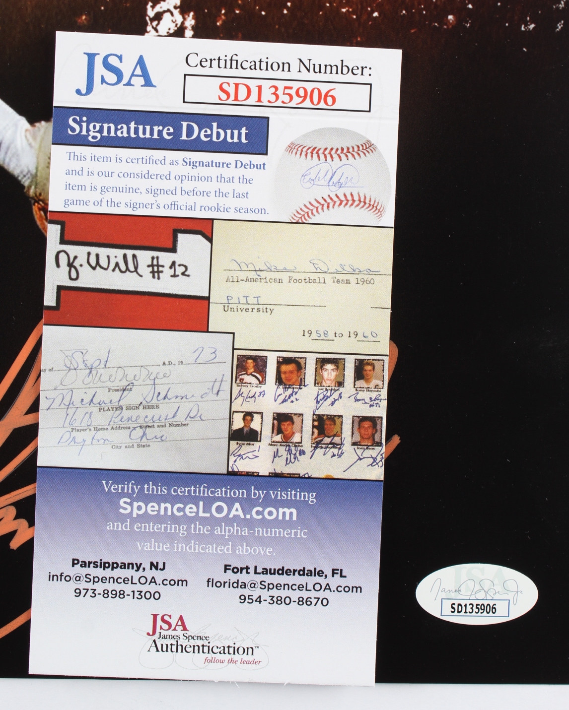 The autograph(s) includes an official James Spence Authentication (JSA) "Signature Debut" hologram and COA. "Signature Debut" is the autographed memorabilia equivalent to a rookie card. The JSA definition of a "Signature Debut" is as follows: "Any item that is autographed and received by JSA prior to the last game of the signer's official rookie season.