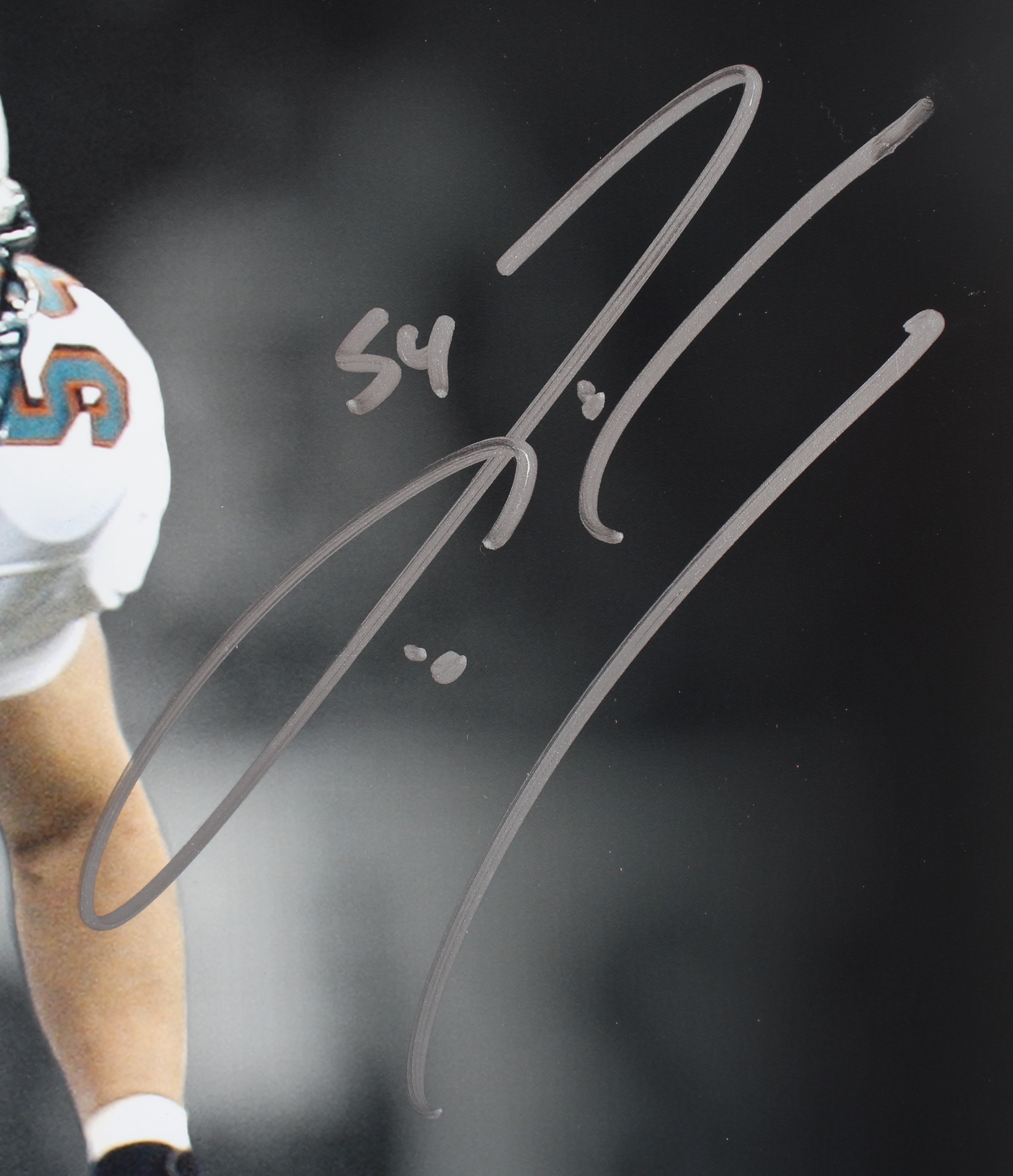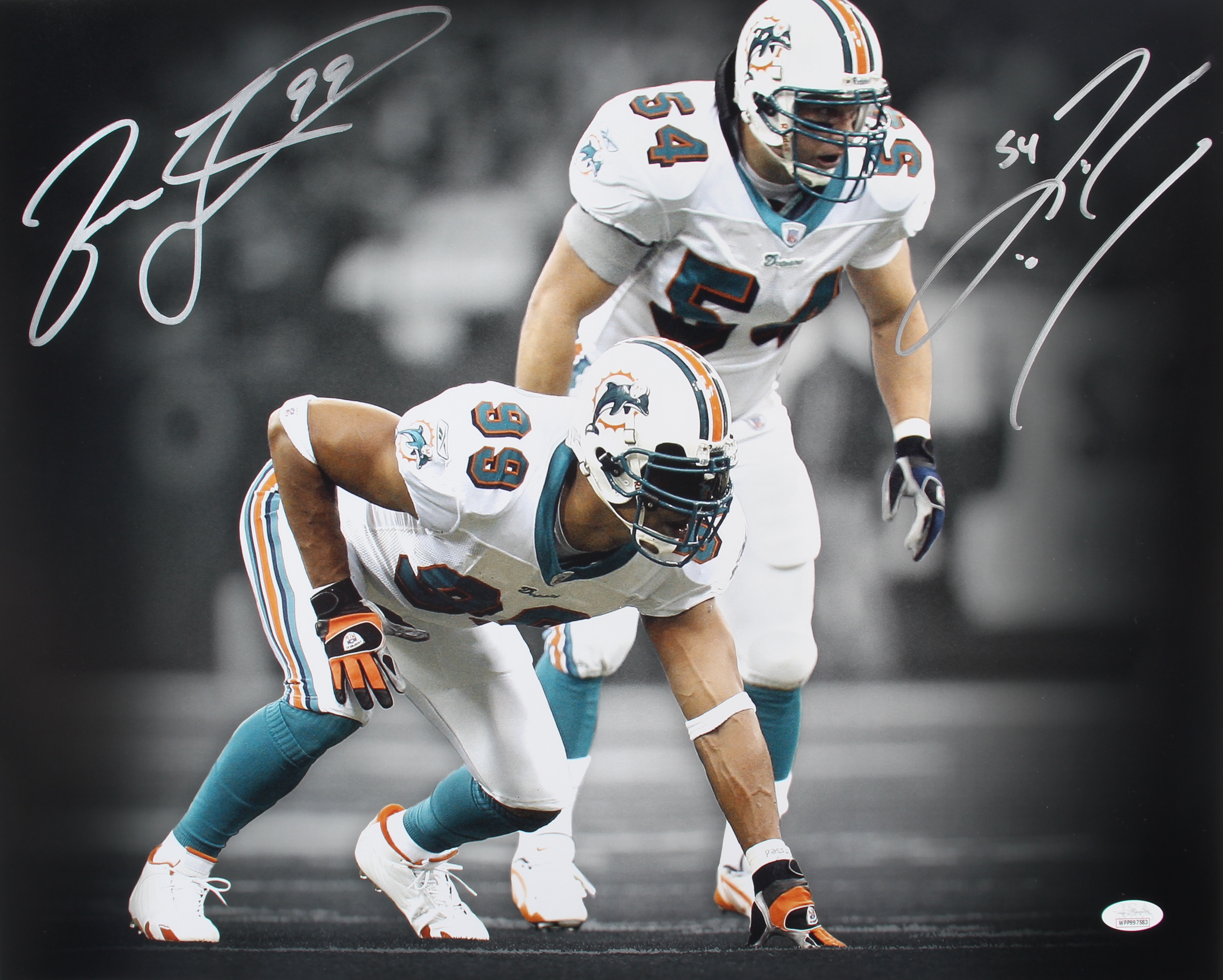 Photo measures 16" x 20" in size and has been hand-signed by Jason Taylor (Miami Dolphins, HOF) and Zach Thomas (Miami Dolphins).