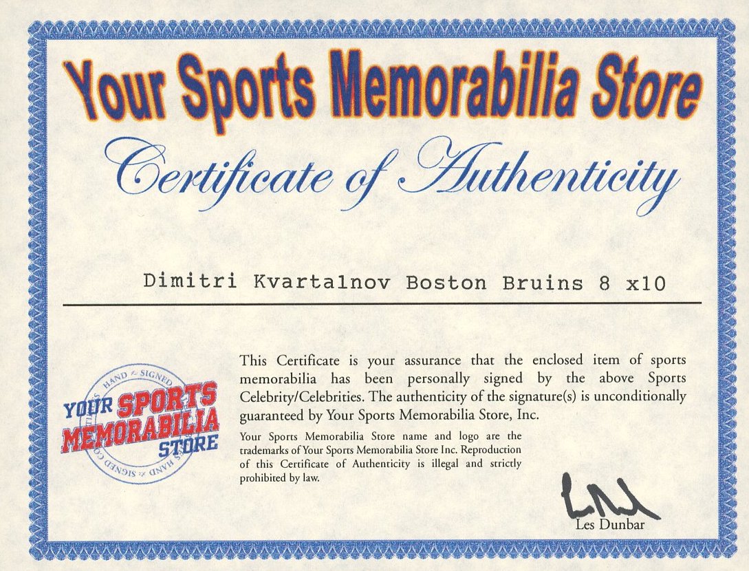 Photo measures 8" x 10" in size and has been hand-signed by Dmitri Kvartalnov (Boston Bruins).