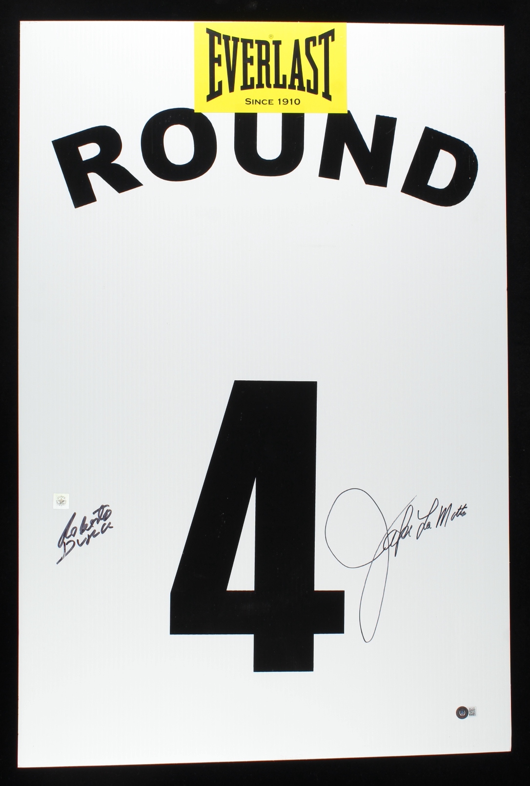 Boxing ring card measures approximately 24" x 36" in size and has been hand-signed by Jake LaMotta (D. 2017, HOF) and Roberto Duran (HOF).Please see images for details regarding the condition.