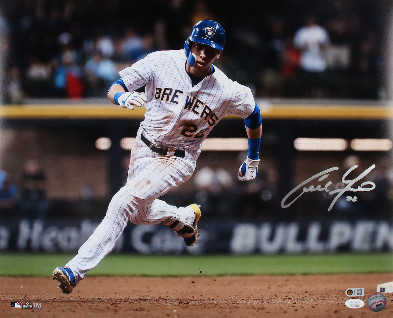 Photo measures 16" x 20" in size and has been hand-signed by Christian Yelich (Milwaukee Brewers).