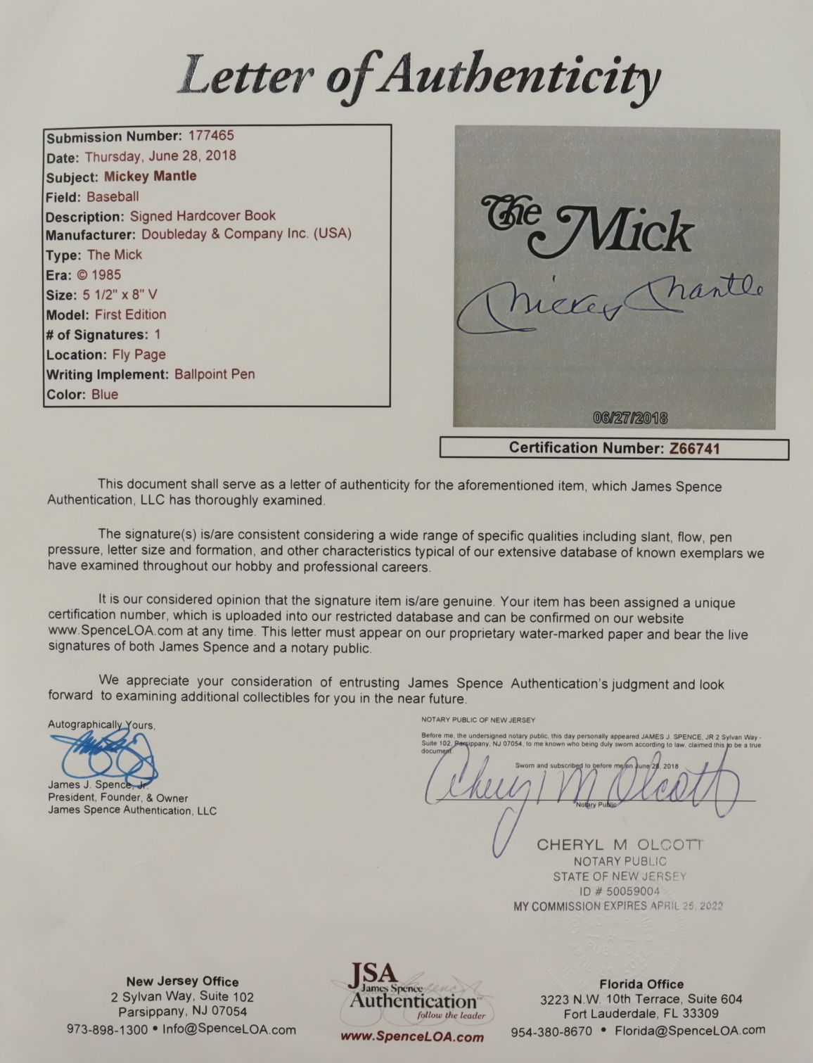 Mickey Mantle Signed "The Mick" Hardcover Book (Beckett LOA & JSA LOA) (See Description)