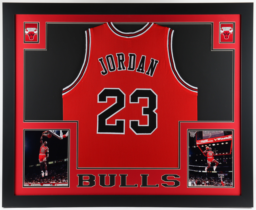 Custom frame measures approximately 35" x 43" in size and features a jersey of Michael Jordan (HOF). Please note, the jersey is unsigned
