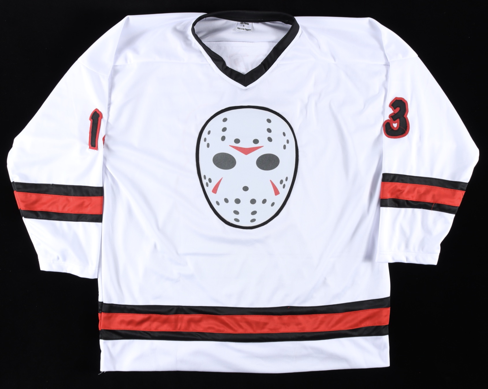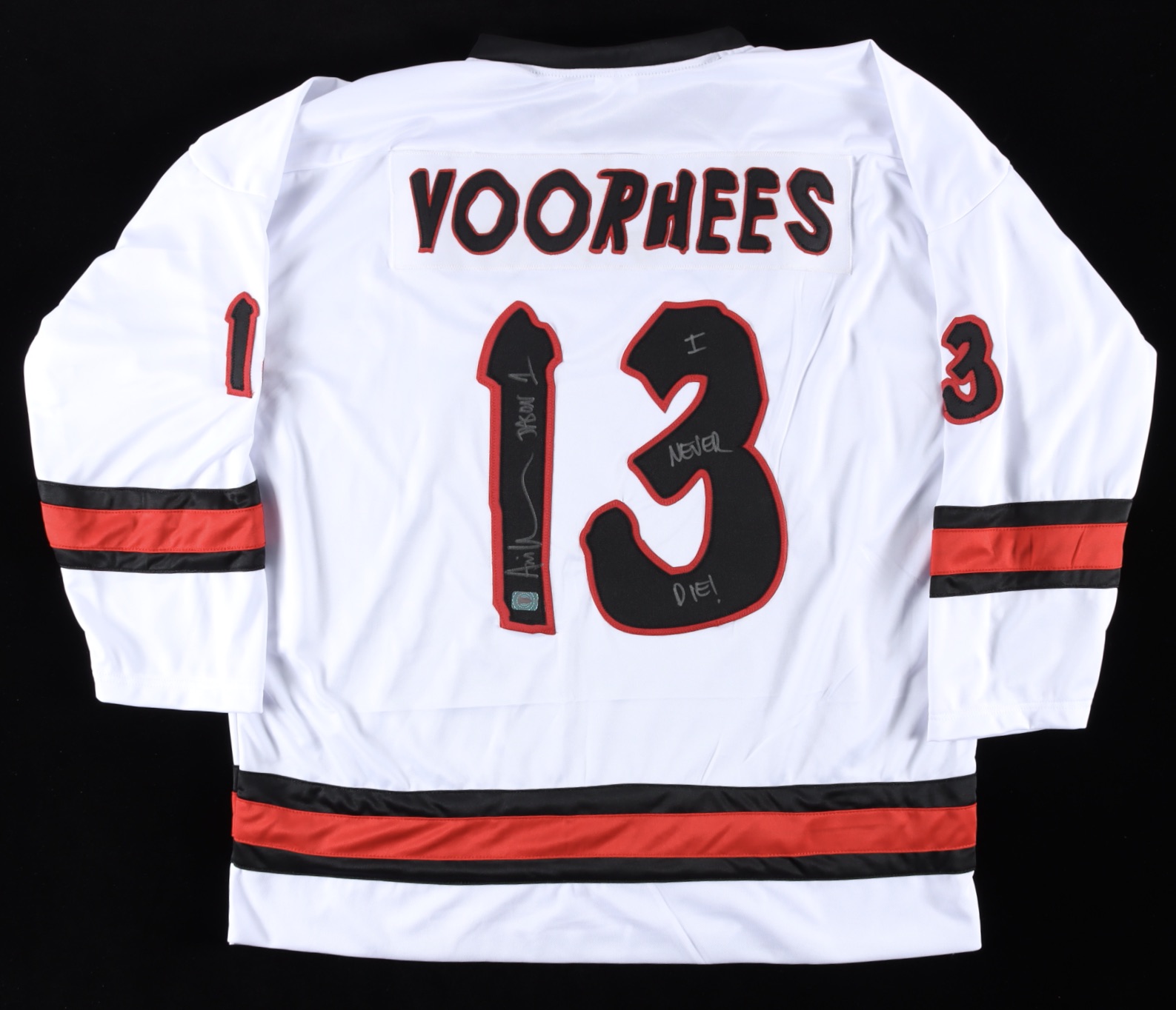 Custom on-ice style jersey. Everything is sewn on, size XL. Hand-signed and inscribed by Ari Lehman (Jason Voorhees).