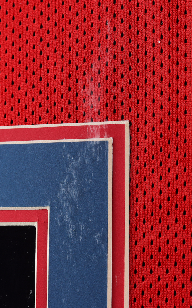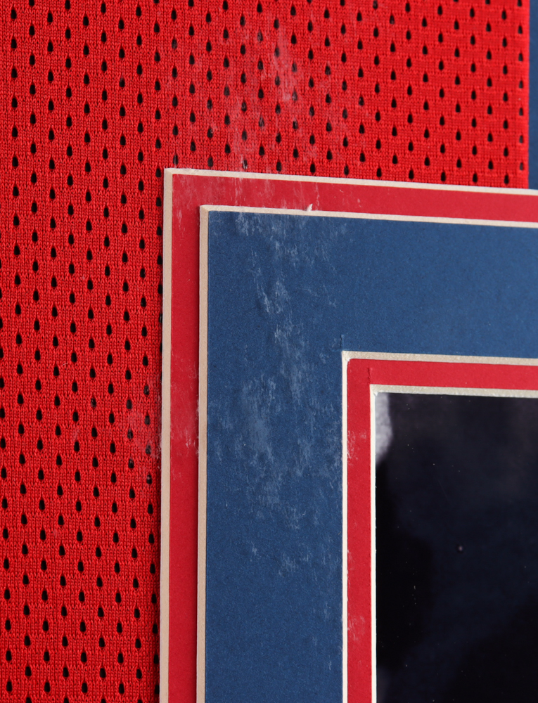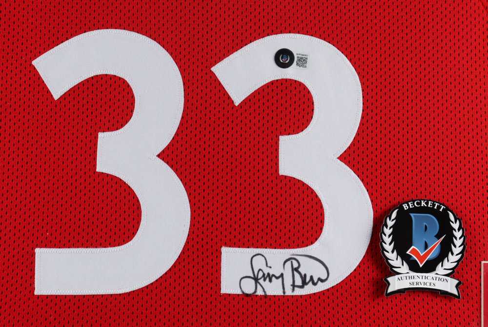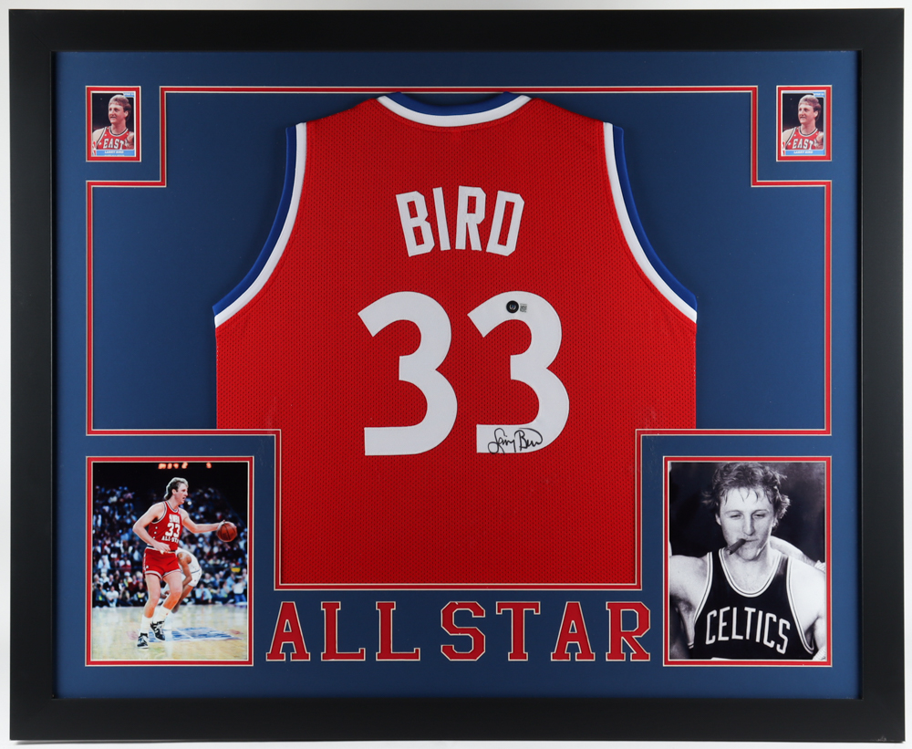 Custom frame measures approximately 35" x 43" in size and features a jersey hand-signed by Larry Bird (HOF). Please note, there is scuffing on the display glass.