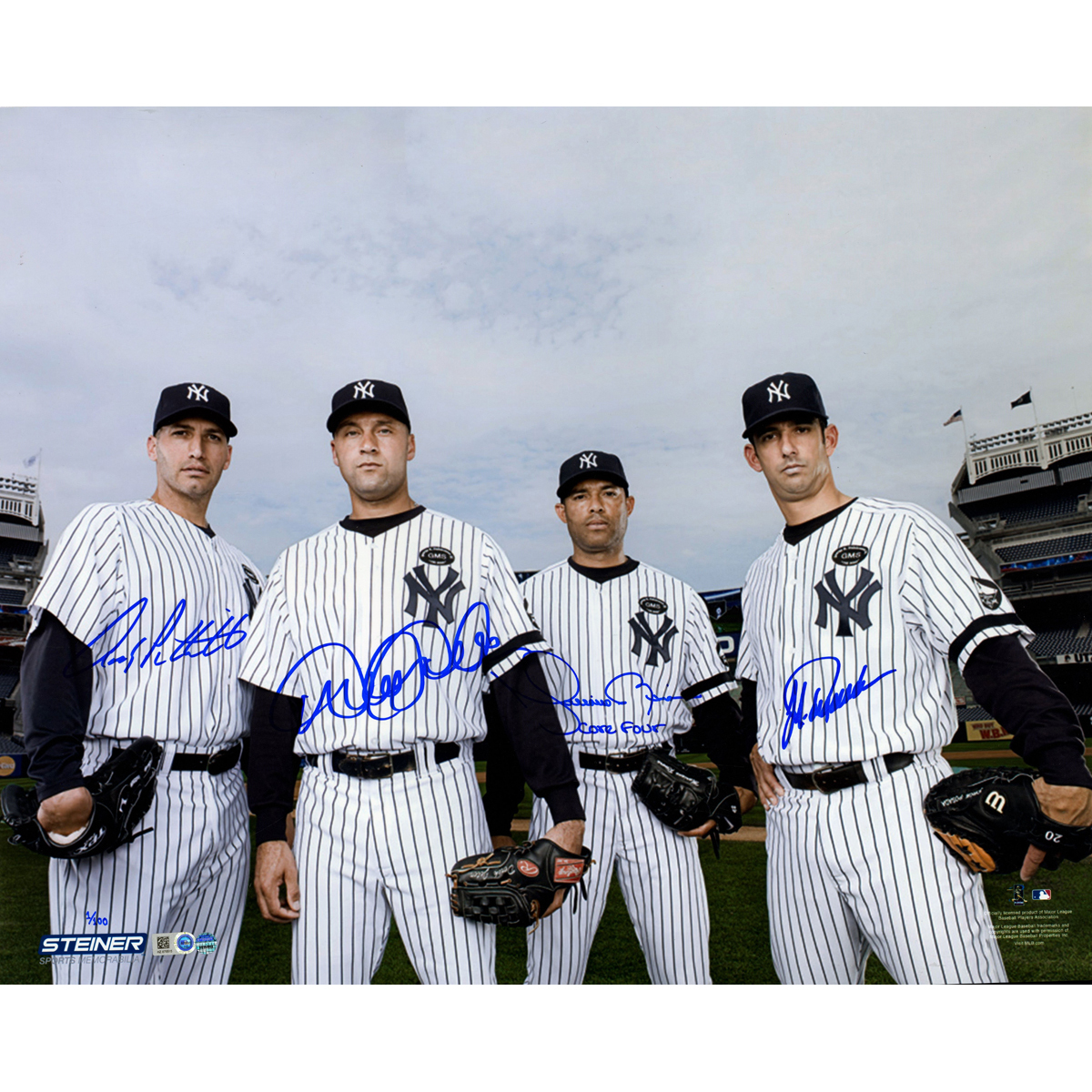 Photo measures 16" x 20" in size. Hand-signed in blue ink pen by Derek Jeter, Mariano Rivera, Andy Pettitte and Jorge Posada. Rivera also added an inscription that reads "Core Four". This photo is a limited edition of 100.