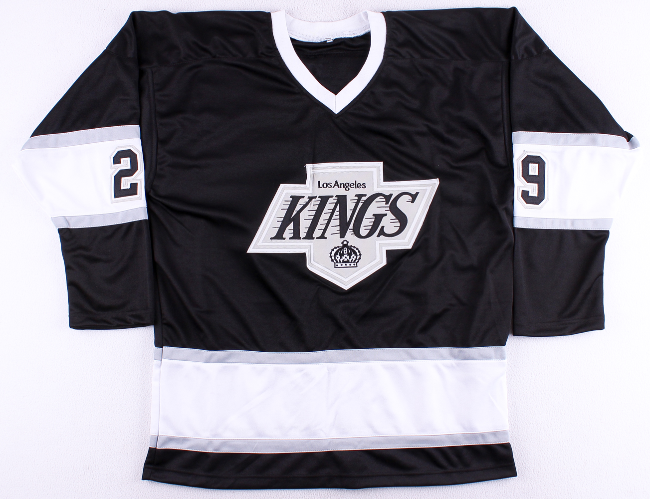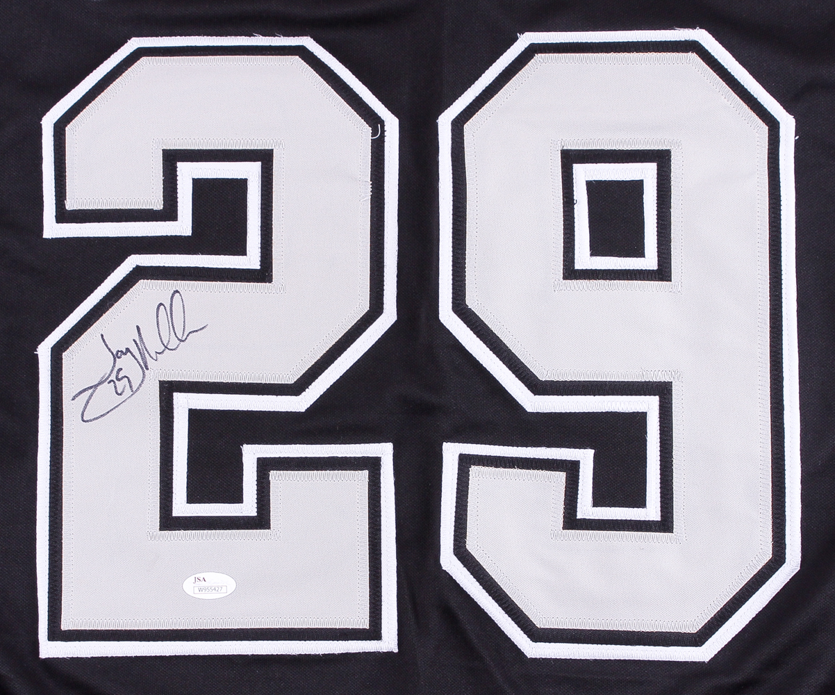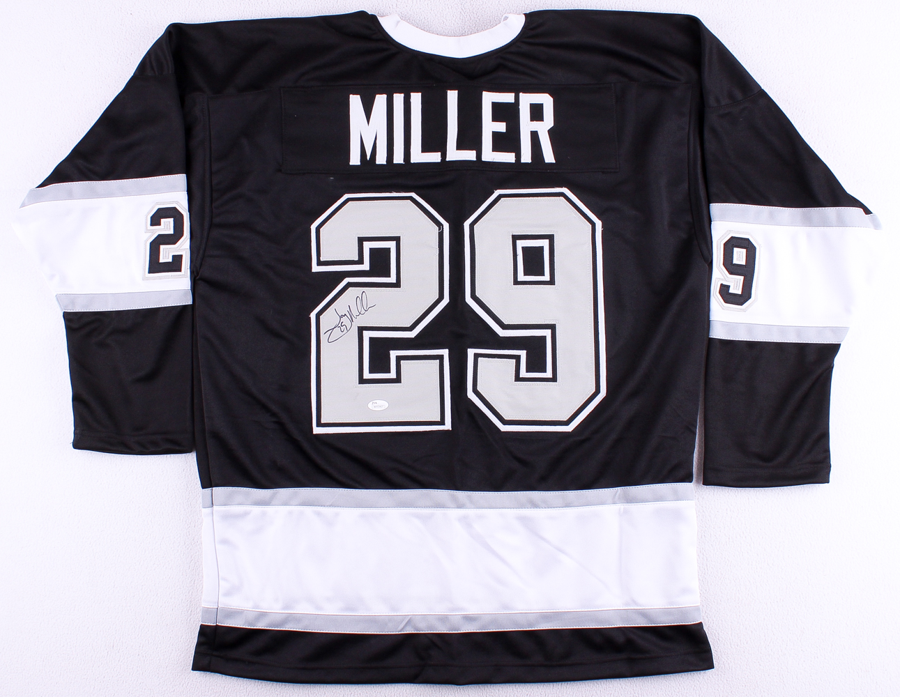 Custom on-ice style jersey. Everything is sewn on, size XL. Hand-signed in black felt-tip pen by Jay Miller (Bruins).