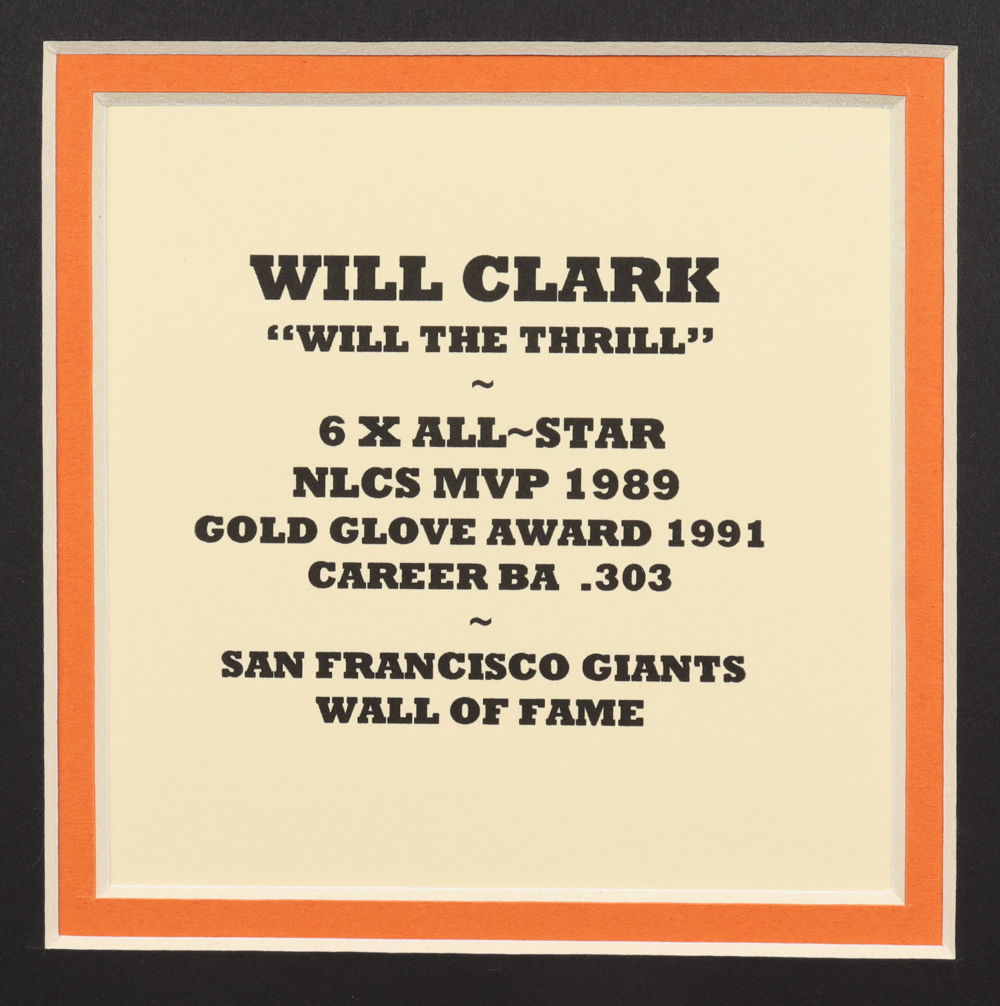Custom matted display measures 14" x 18" in size and features a 1988 Donruss #204 baseball card hand-signed by Will Clark (San Francisco Giants) and an unsigned photograph.