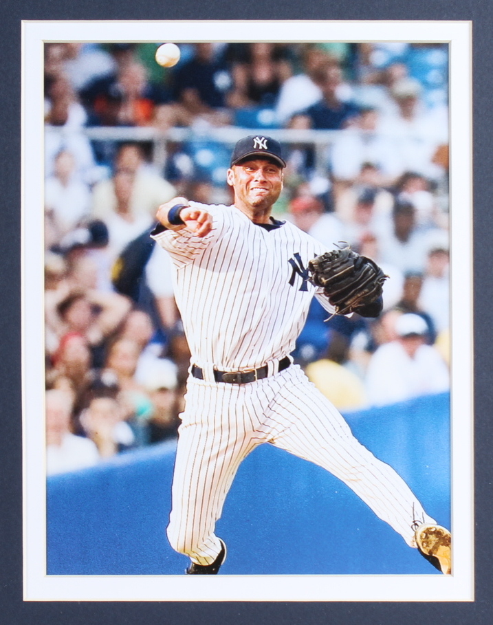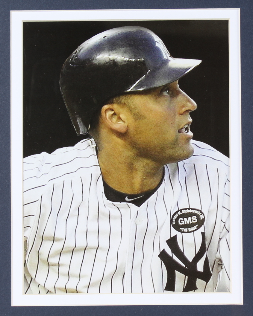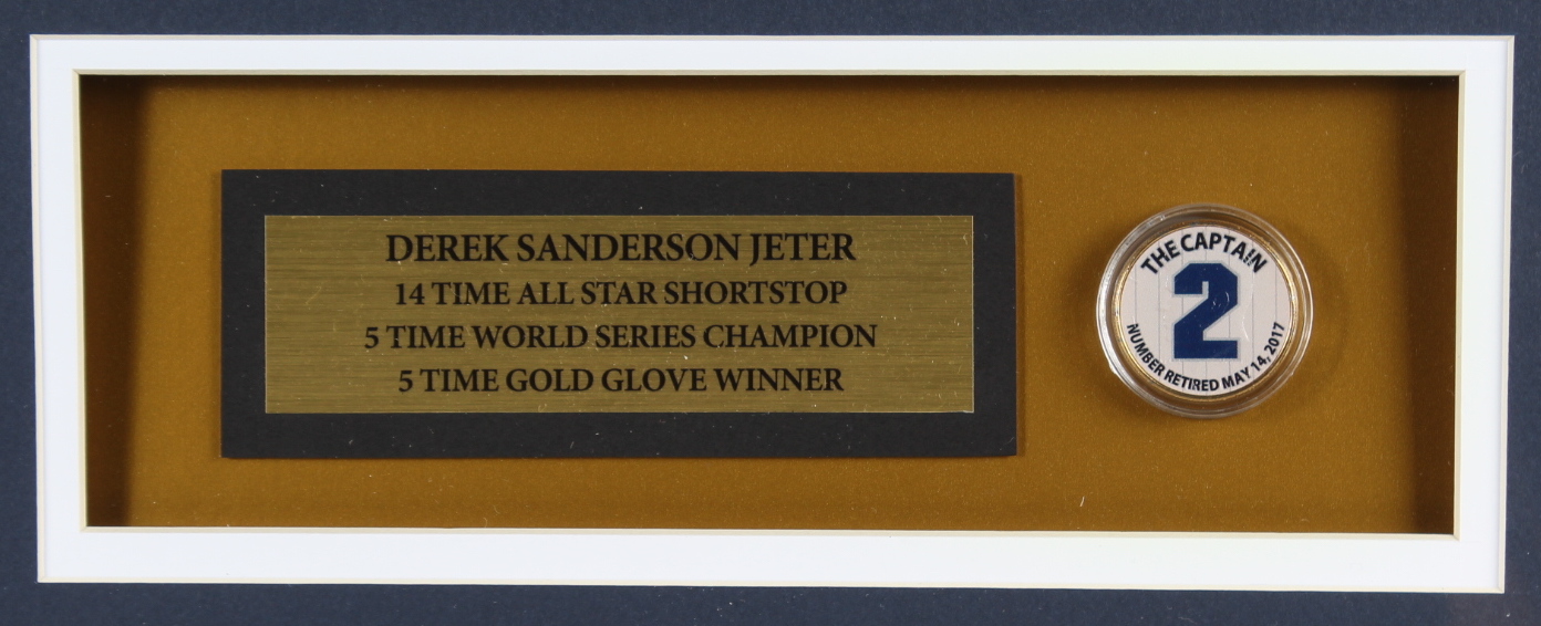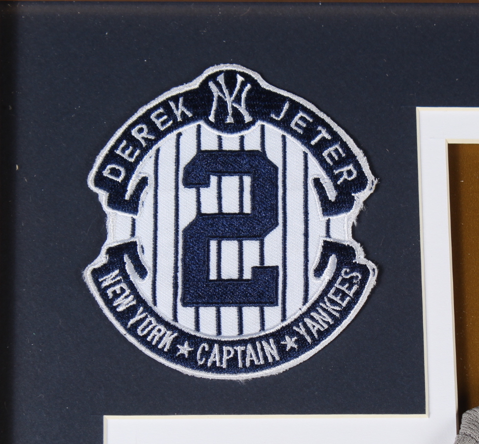 Custom framed display measures 32" x 36" in size and features a Derek Jeter (New York Yankees, HOF) jersey, an Official "The Captain" pin and two 8" x 10" photos. Please note, the jersey is not signed.