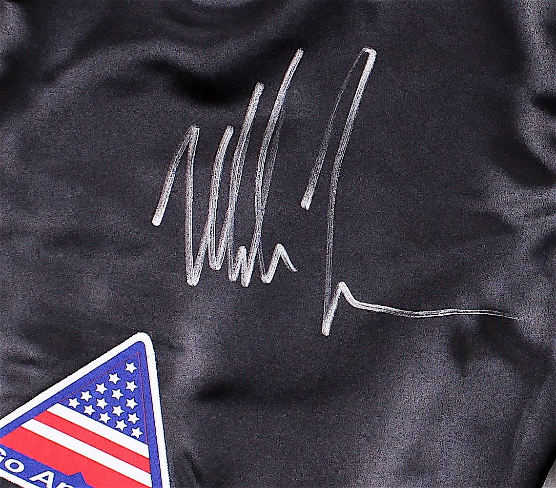 Fight style boxing shorts, size L. Hand-signed in silver paint-pen by Mike Tyson.