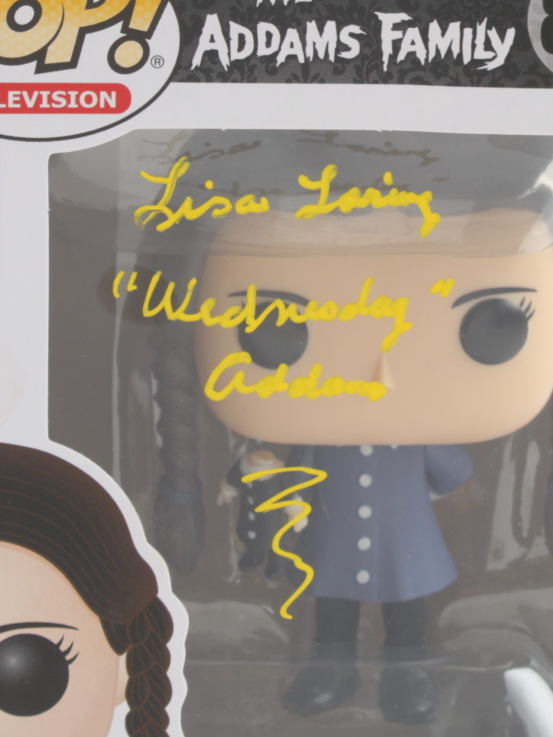 Vinyl figure measures approximately 4" tall and has been hand-signed and inscribed on the packaging by Lisa Loring (Wednesday Adams). See photos for condition of the box.