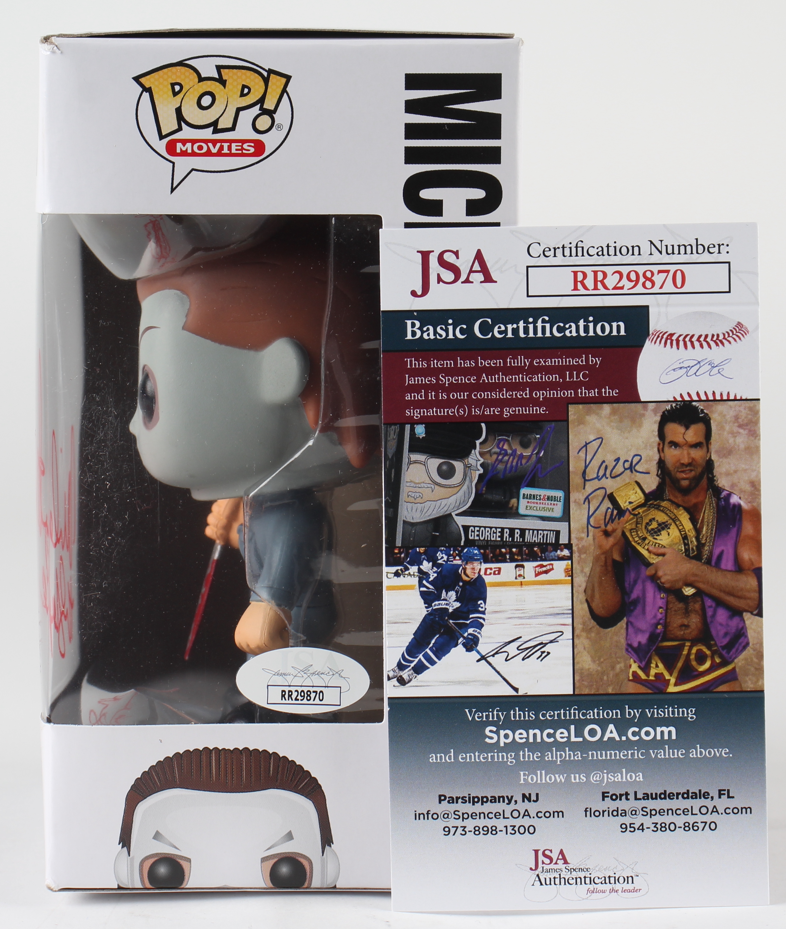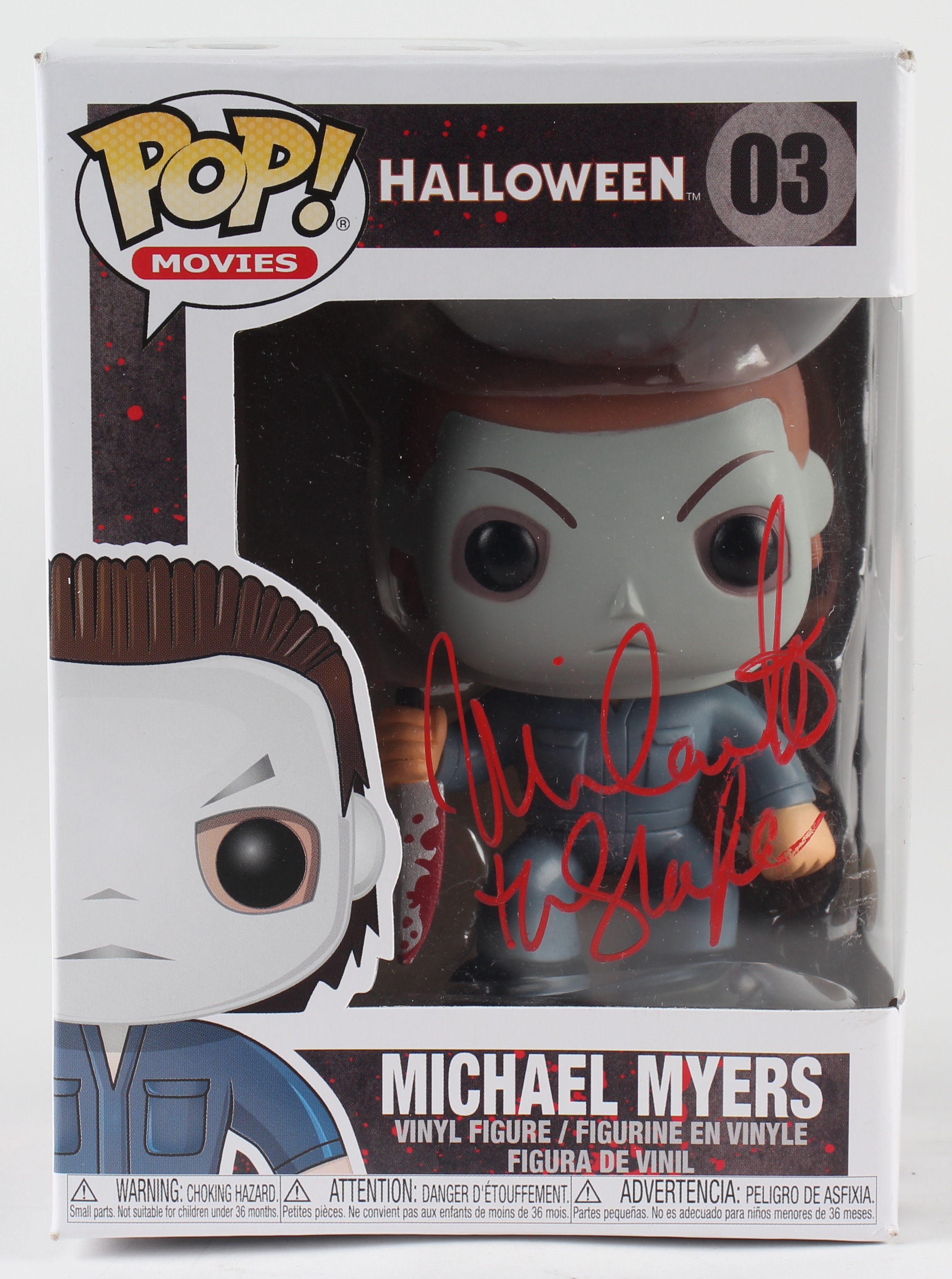 Vinyl figure measures approximately 4" tall and has been hand-signed and inscribed on the packaging by Nick Castle (Michael Myers). Please see photos regarding the condition of the packaging.