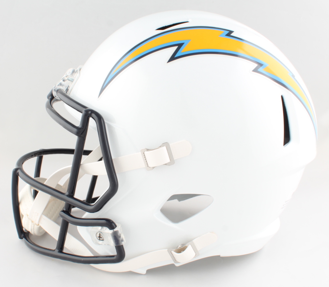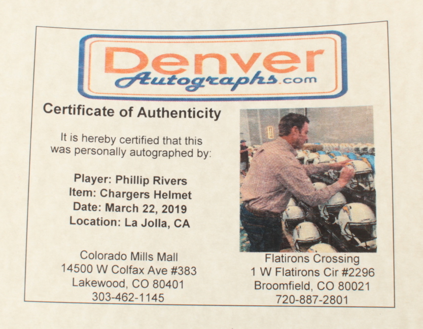 Riddell San Diego Chargers replica full-size speed helmet. Hand-signed by Phillip Rivers. Please see photos for condition of helmet.