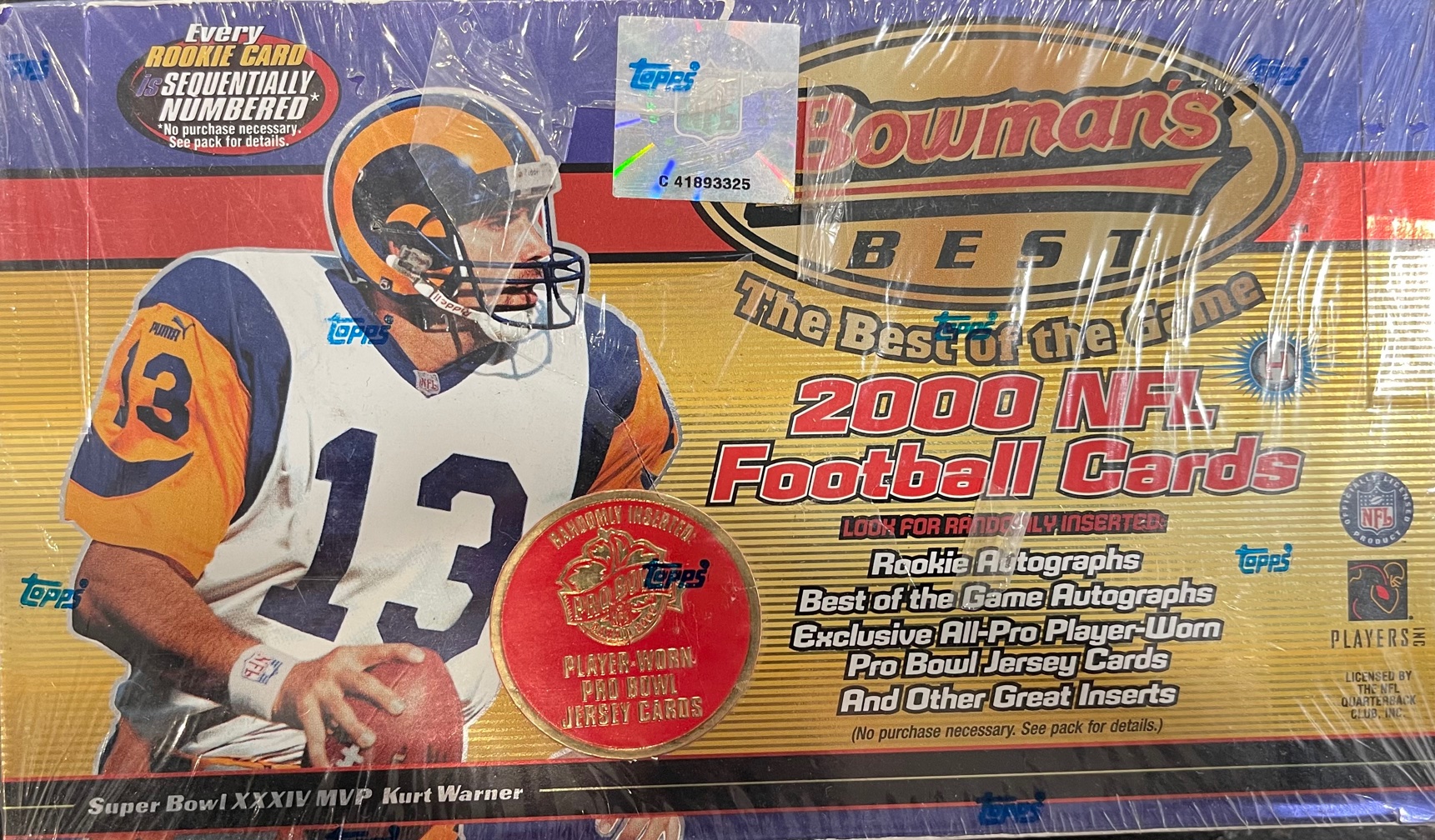 (24) packs per box, (5) cards per pack. Look for randomly inserted All-Pro Pro Bowl Game Worn Jersey Cards!!! Look for key rookies such as: Shaun Alexander, Brian Urlacher, Jamal Lewis, Plaxico Burress, Chad Pennington, Thomas Jones, Jerry Porter, Reuben Droughns, Laveranues Coles Base set: 50 Rookies 1:11 - numbered to 1499 Parallels: Bowman's Best 1:22 - numbered to 250 Inserts: Franchise 2000 1:12 Best Bets 1:19 Year by Year 1:20 Autographs 1:2935 Rookie Autographs 1:83 All-Pro Game Worn Jerseys 1:112 Best of the Game Autographs 1:837 Please note, factory seal has been broken.