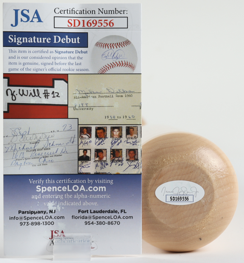 The autograph(s) includes an official James Spence Authentication (JSA) "Signature Debut" hologram and COA. "Signature Debut" is the autographed memorabilia equivalent to a rookie card. The JSA definition of a "Signature Debut" is as follows: "Any item that is autographed and received by JSA prior to the last game of the signer's official rookie season.