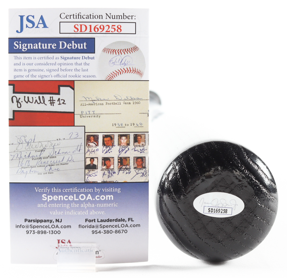 The autograph(s) includes an official James Spence Authentication (JSA) "Signature Debut" hologram and COA. "Signature Debut" is the autographed memorabilia equivalent to a rookie card. The JSA definition of a "Signature Debut" is as follows: "Any item that is autographed and received by JSA prior to the last game of the signer's official rookie season.