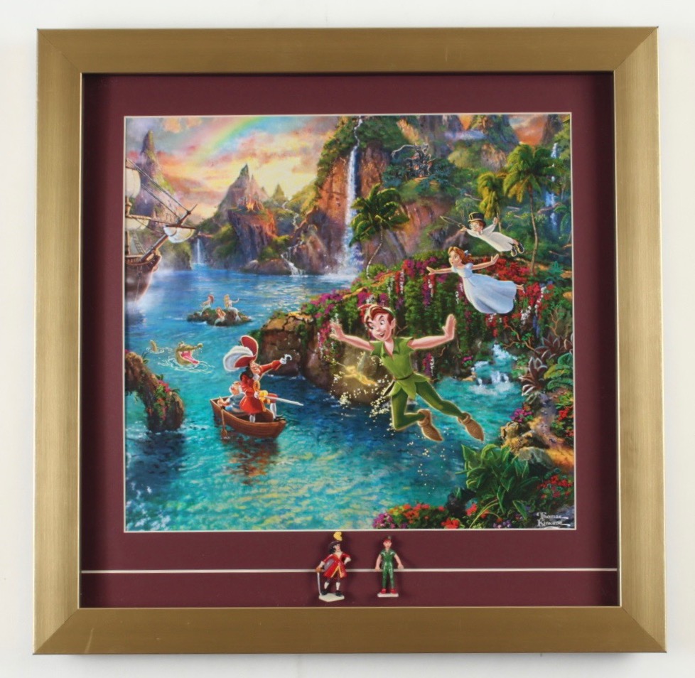 Custom frame measures 16" x 16" in size and features a print of "Peter Pan" by Thomas Kinkade (D. 2012). Display also features two "Peter Pan" movie pins. Please note, the frame shows signs of handling.