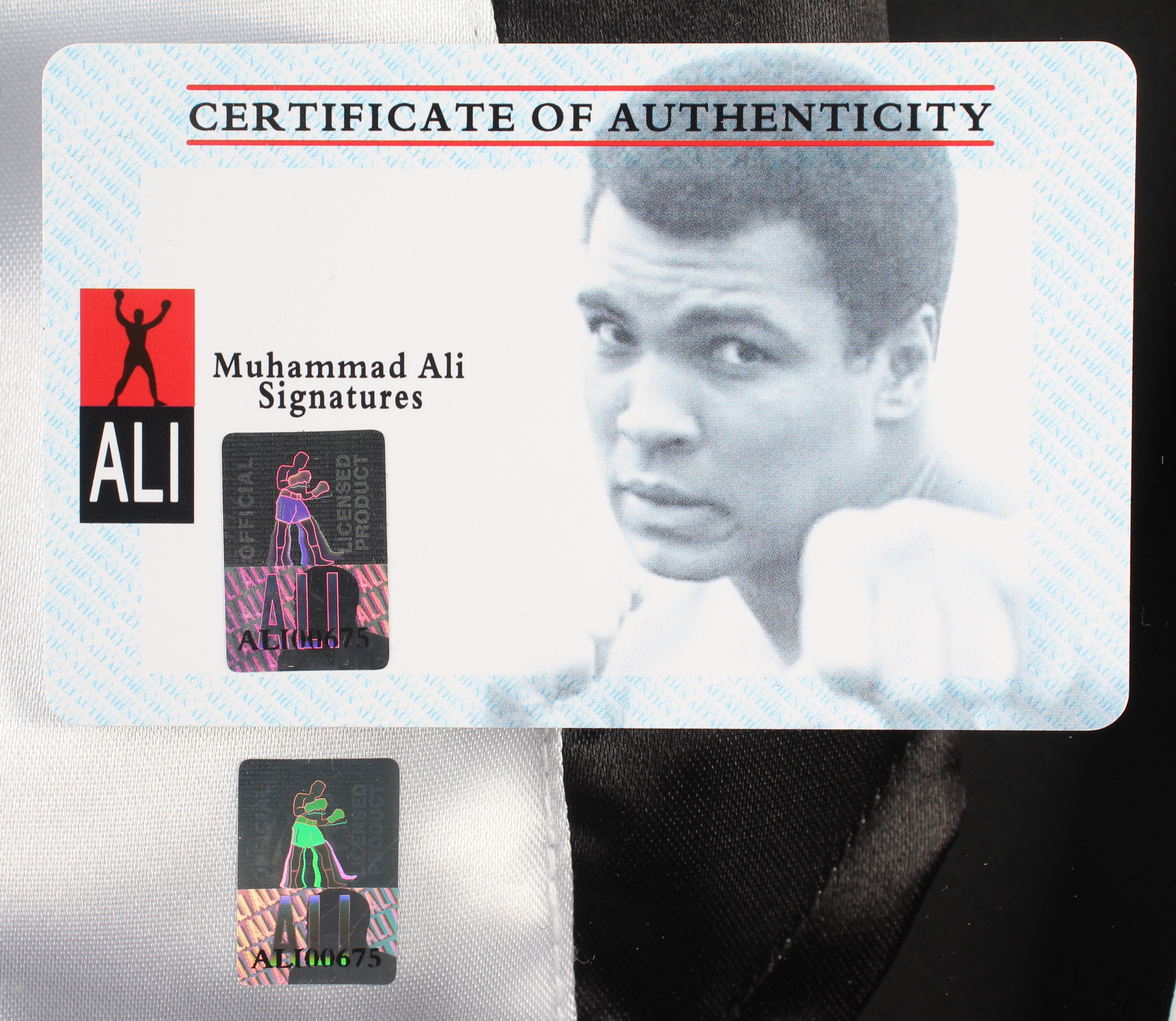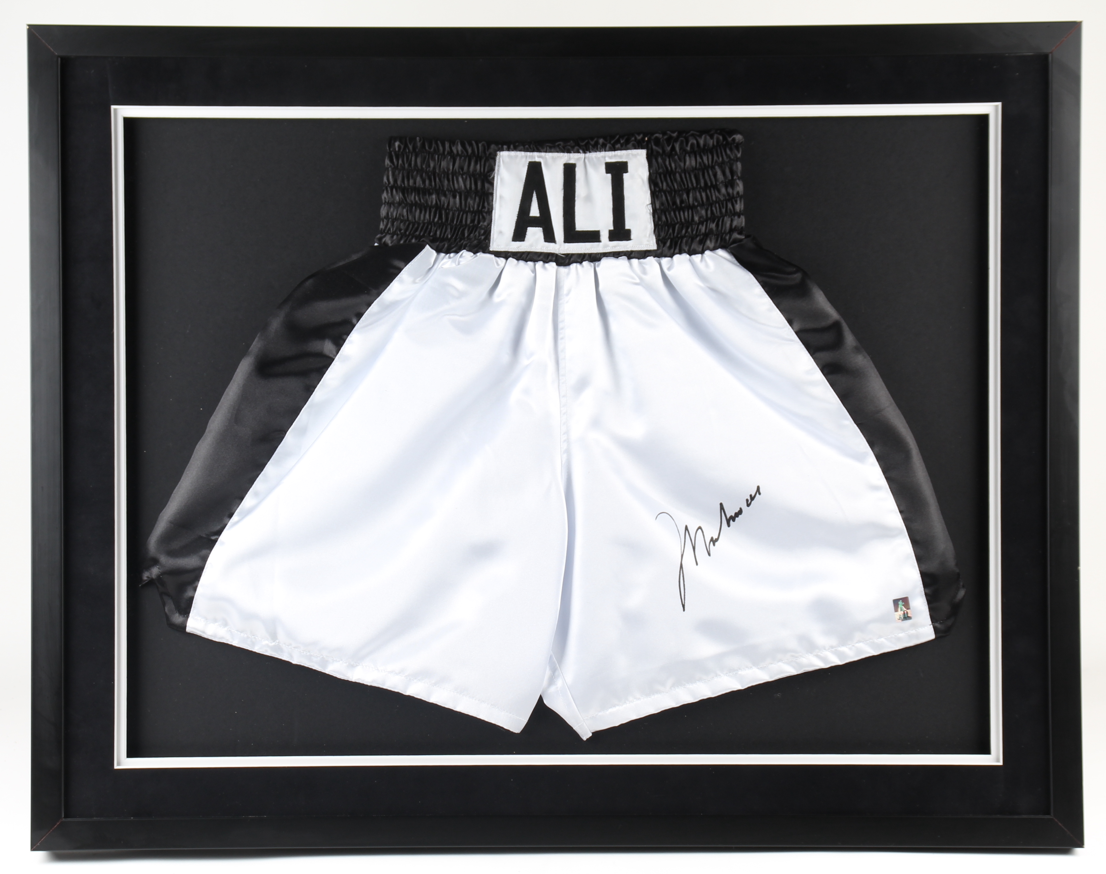 Custom framed display measures approximately 26" x 33" in size and features a pair of vintage Muhammad Ali style boxing shorts that have been hand-signed by Muhammad Ali (D. 2016, HOF). Please note, the frame has been slightly damaged.
