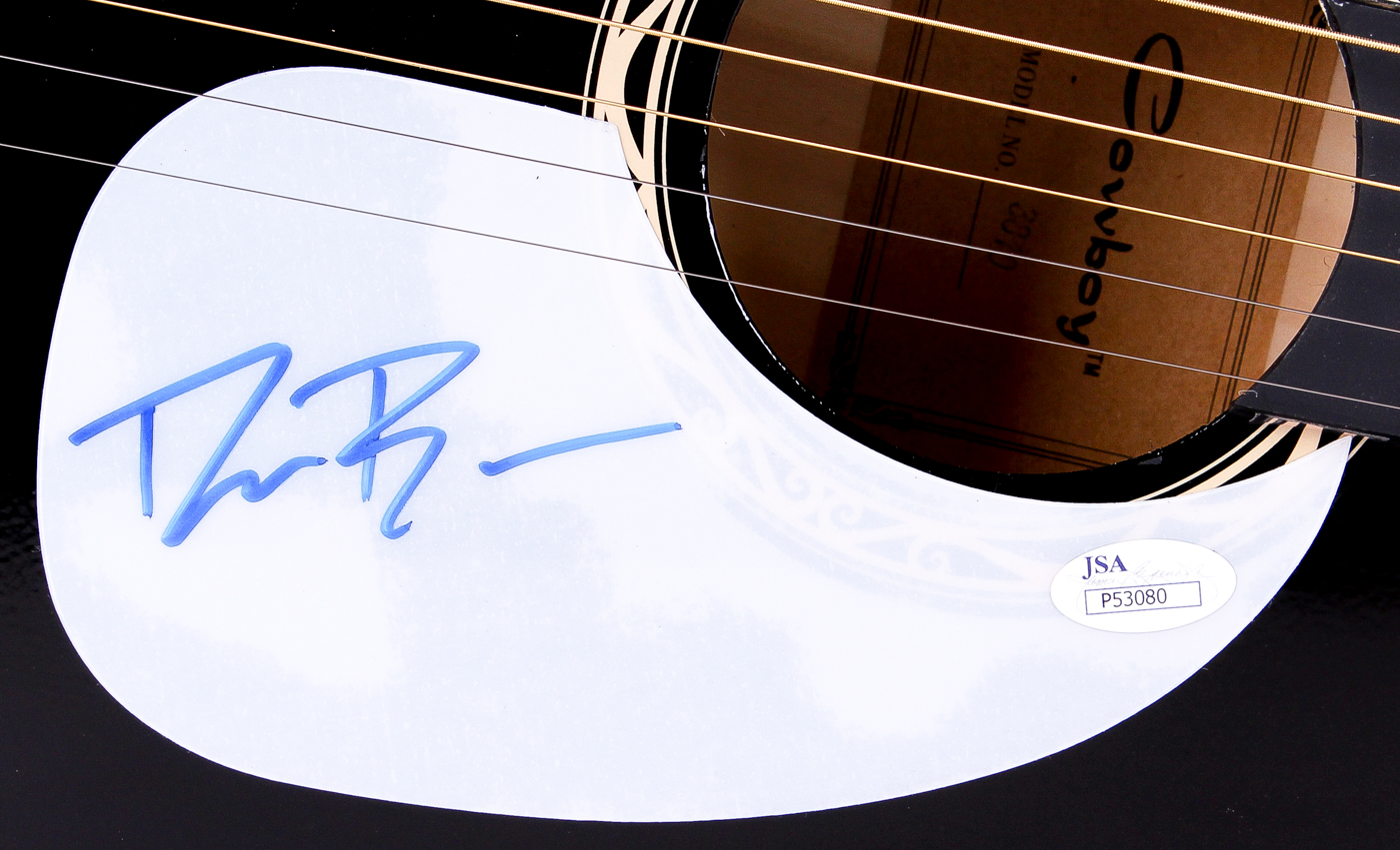 Cowboys acoustic guitar measures 38" in length. Hand-signed on the pick guard in blue felt tip pen by Dierks Bentley.