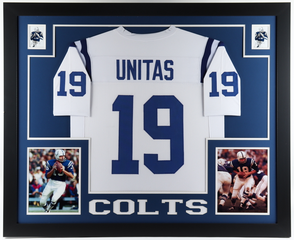 Custom frame measures 35.5" x 43.5" in size and features a jersey of Johnny Unitas (D. 2002, HOF). Please note, the display is unsigned.