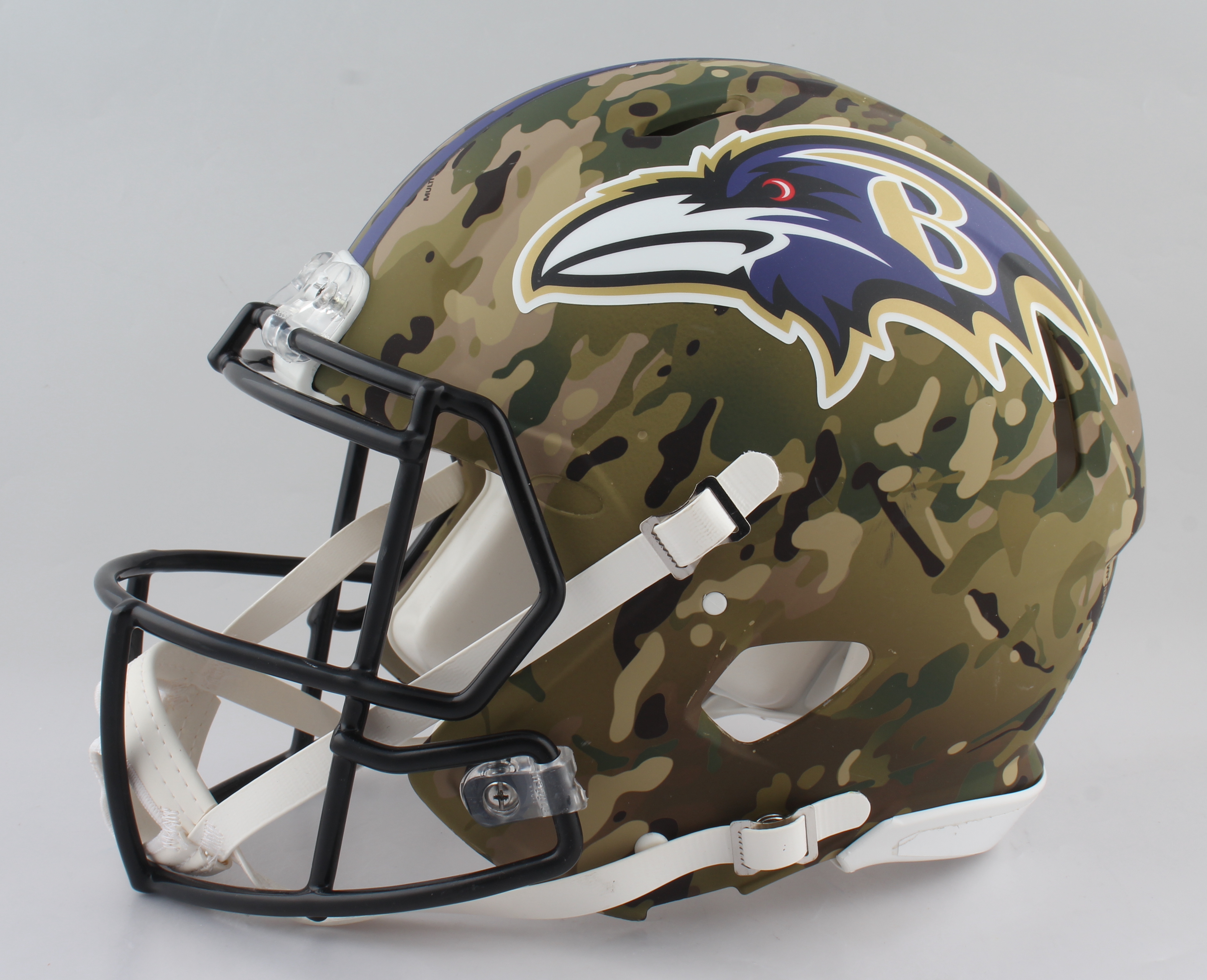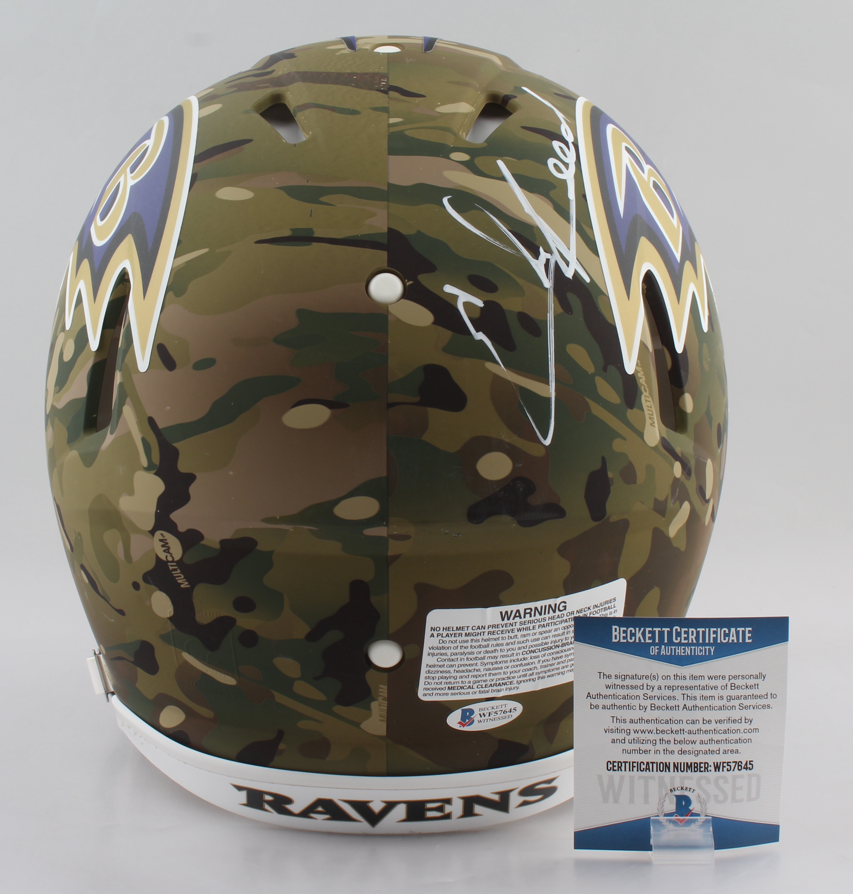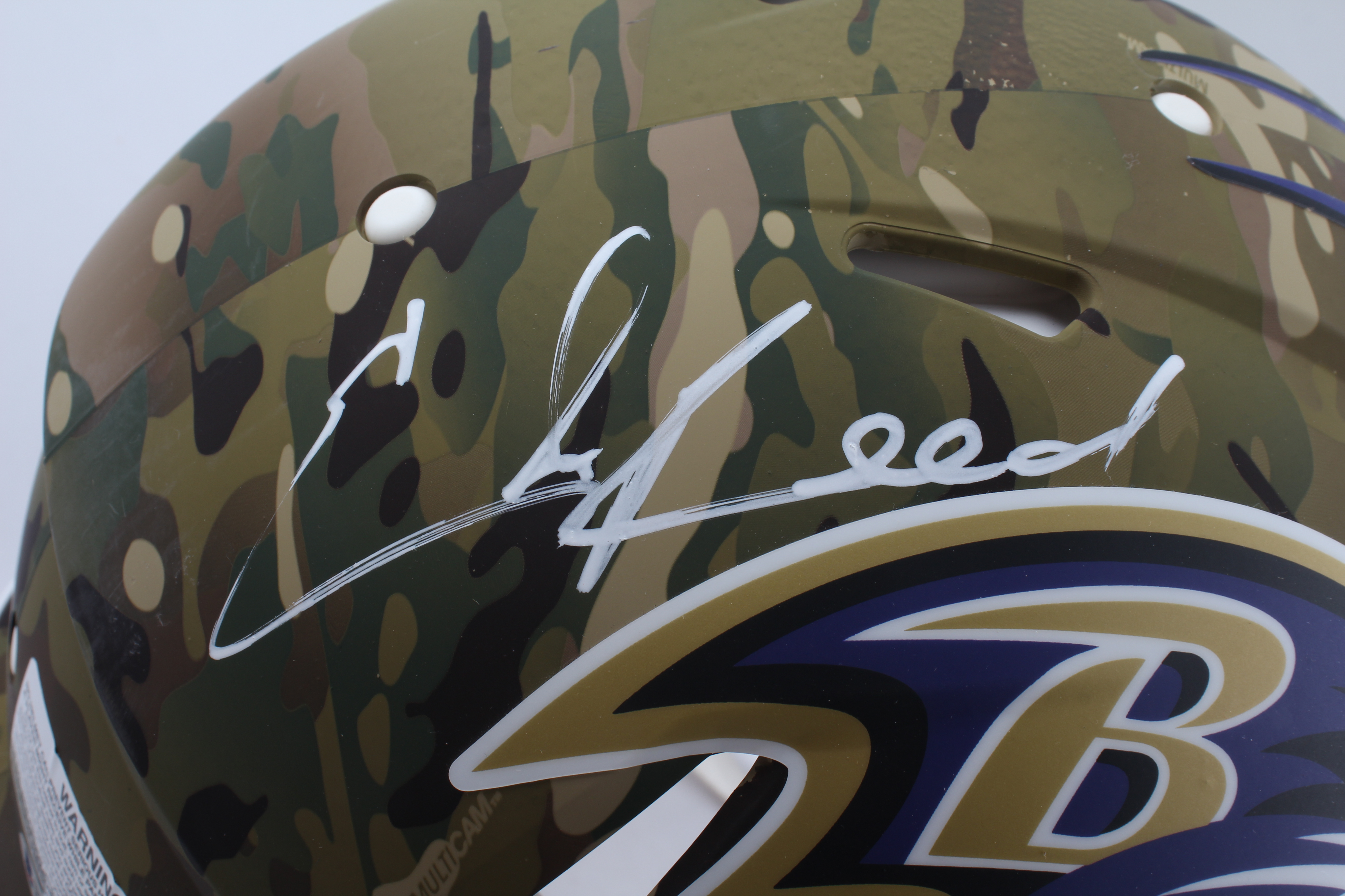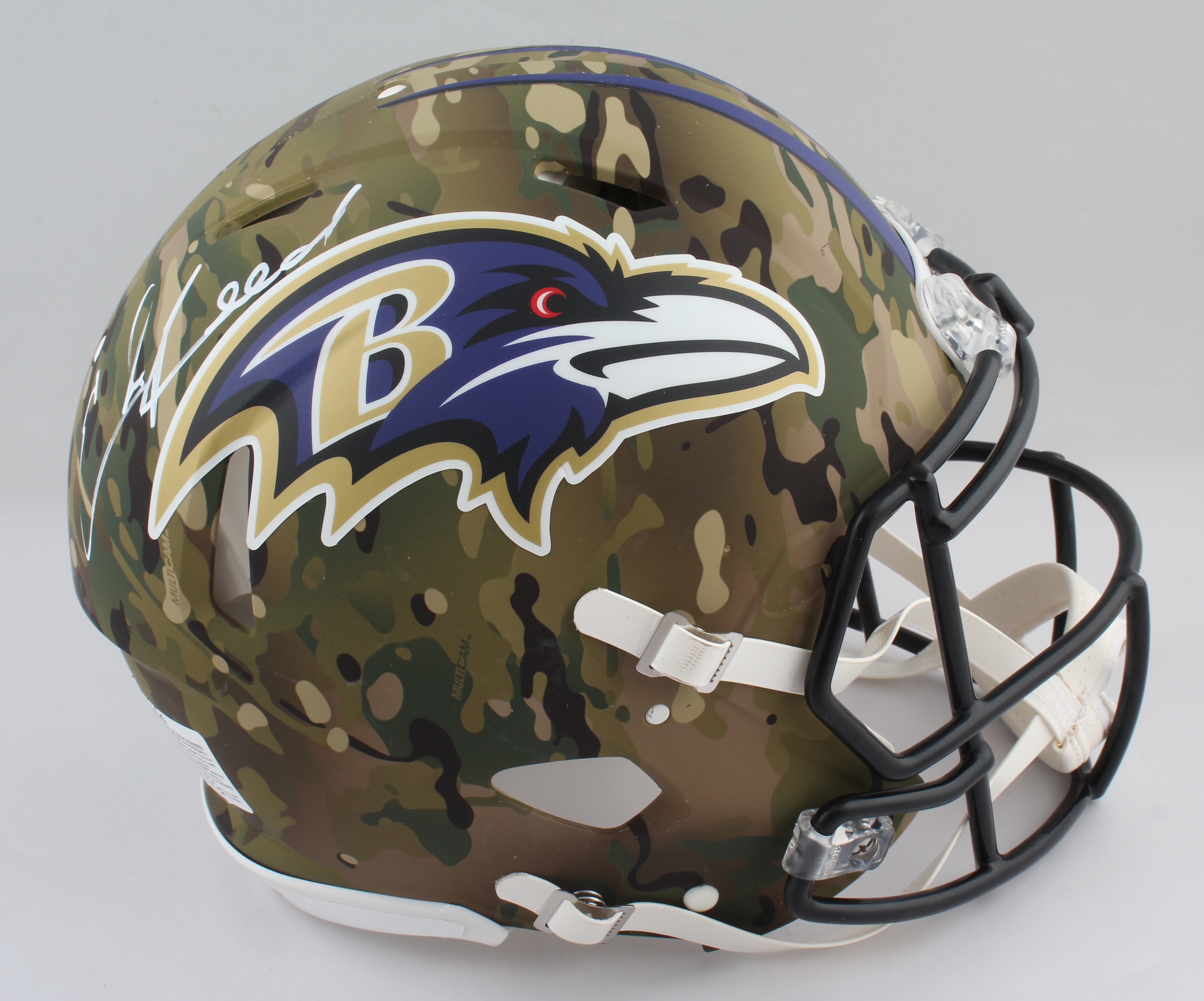 Riddell Baltimore Ravens full-size authentic on-field camo alternate speed helmet. Hand-signed by Ed Reed (HOF).
