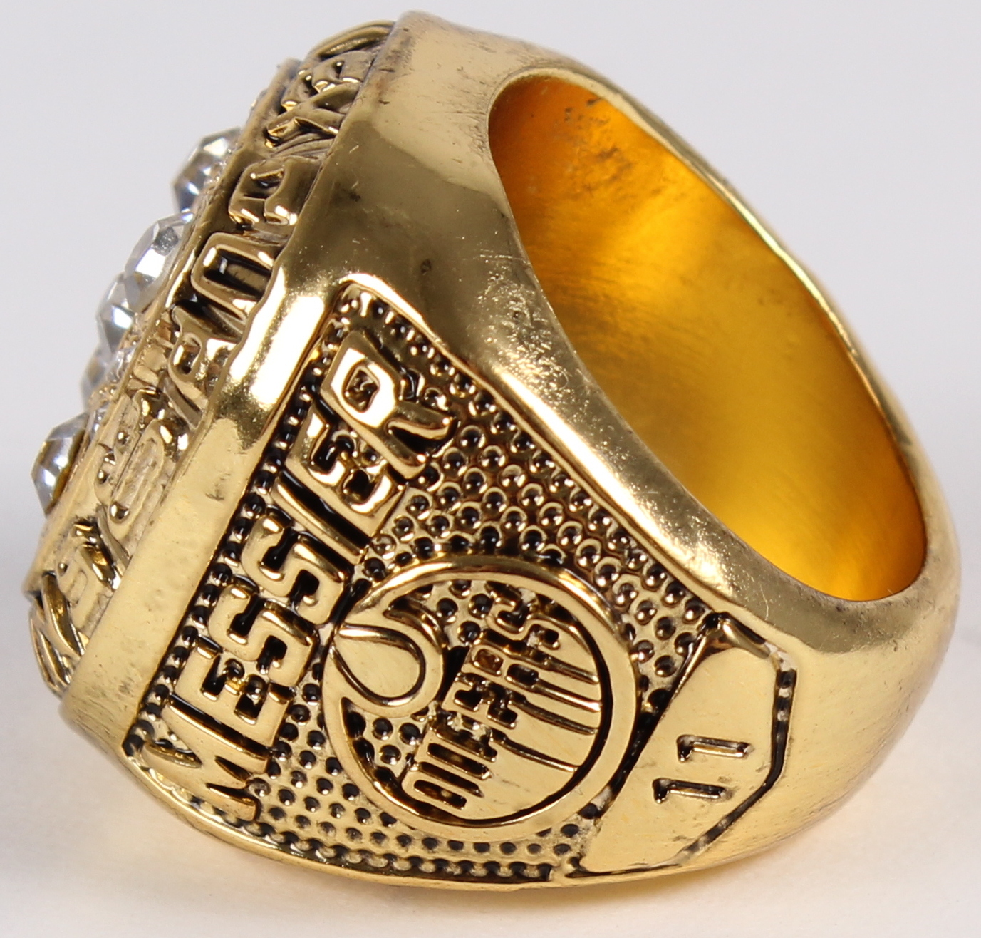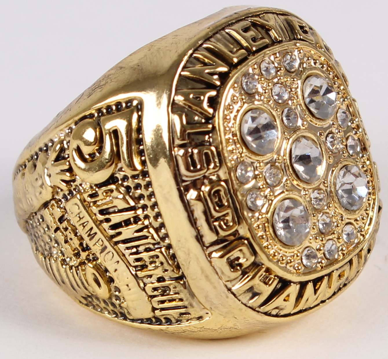 Mark Messier Edmonton Oilers High Quality Replica 1990 Stanley Cup Champions Ring. The ring has been hand crafted by professional jewelers. Made of metal alloy and clad with 18K Gold. Size 10.
