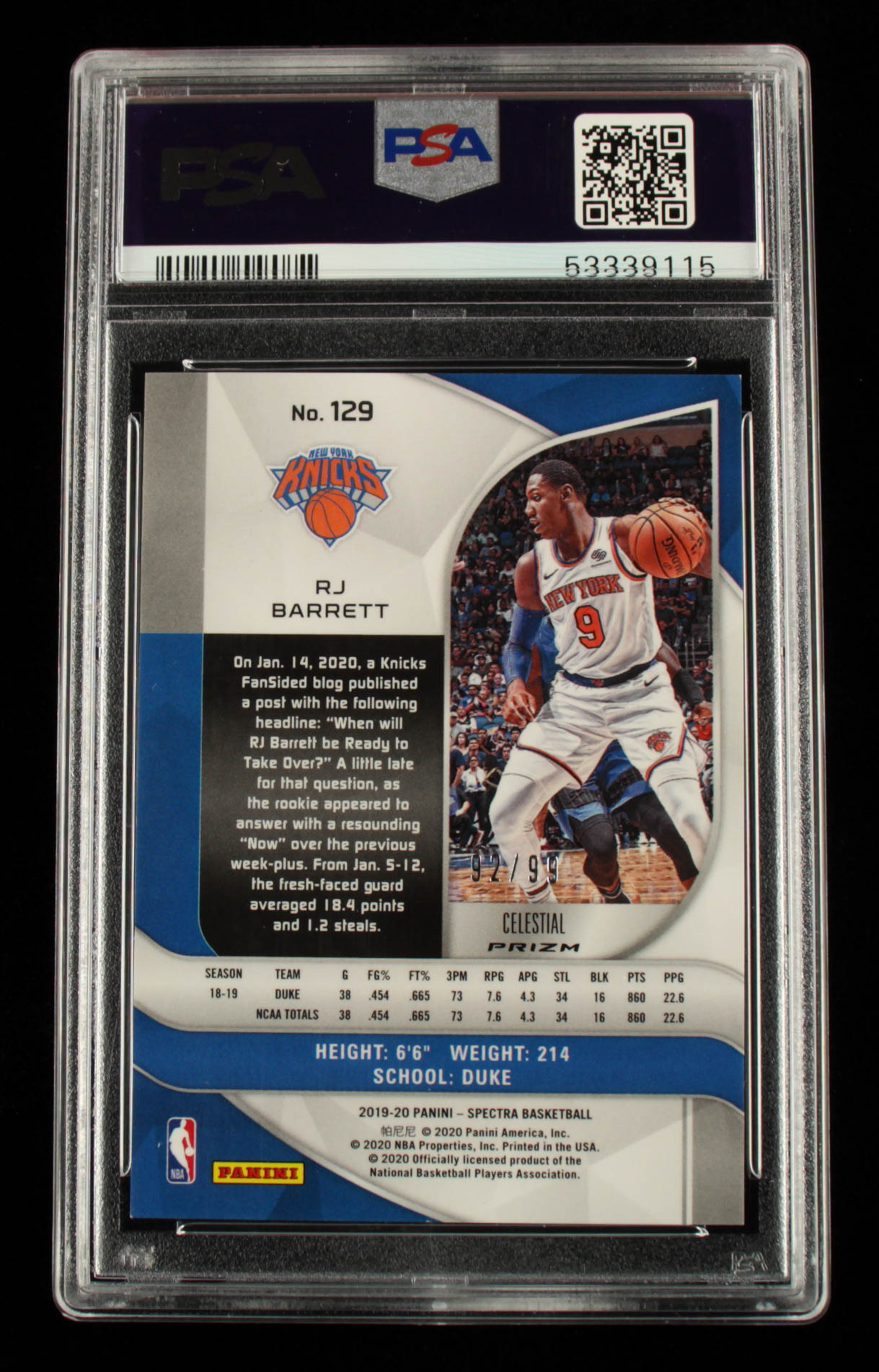 RJ Barrett 2019-20 Panini Spectra Celestial #129 #92/99 (PSA 9)