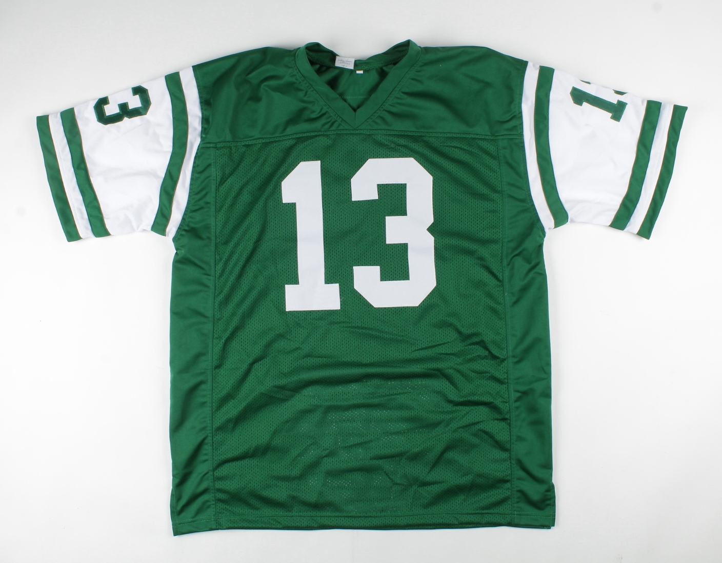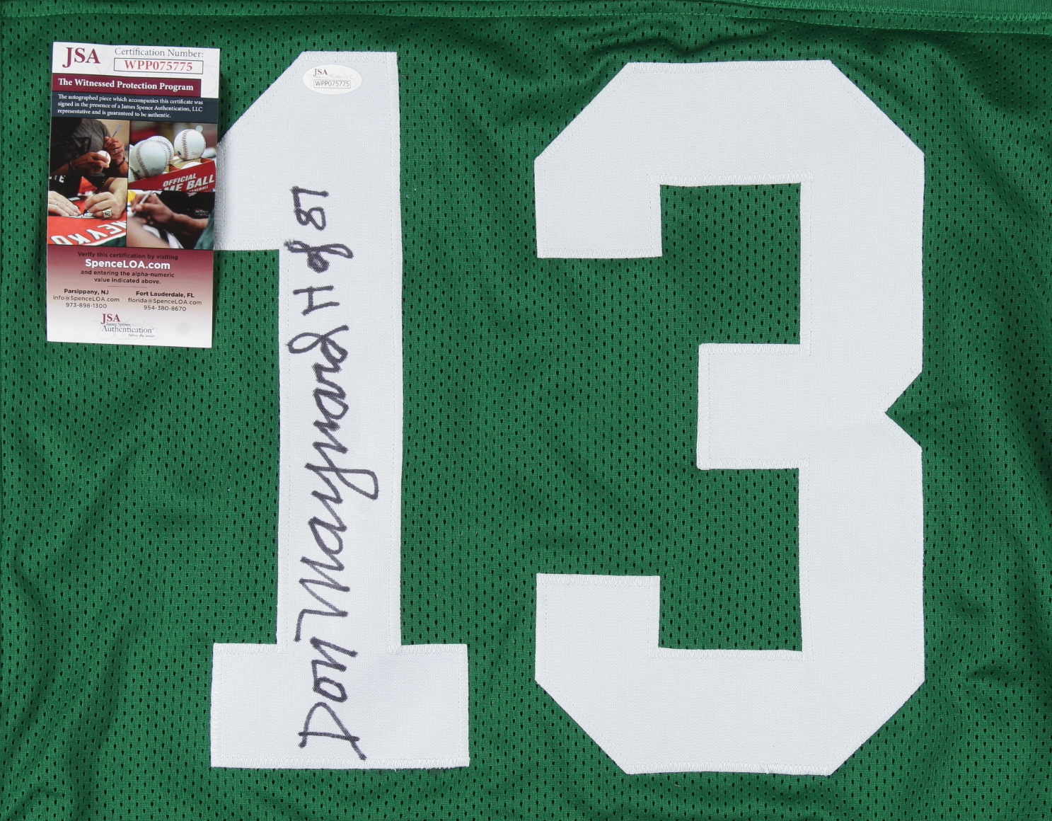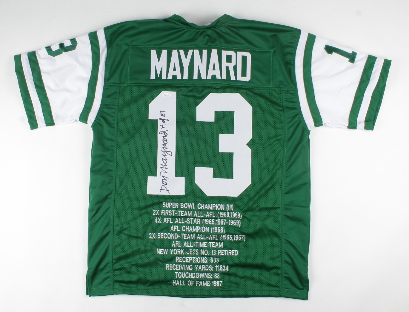 Custom on-field style jersey. Everything is sewn on, size XL. Hand-signed and inscribed by Don Maynard (HOF). Maynard's career stats have been custom stitched in the jersey below the reverse numbers.