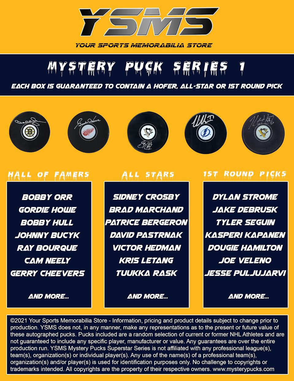 Each YSMS Mystery Puck box will include only HOFers! All-Stars or 1st Round Draft Picks! Nothing but heat!