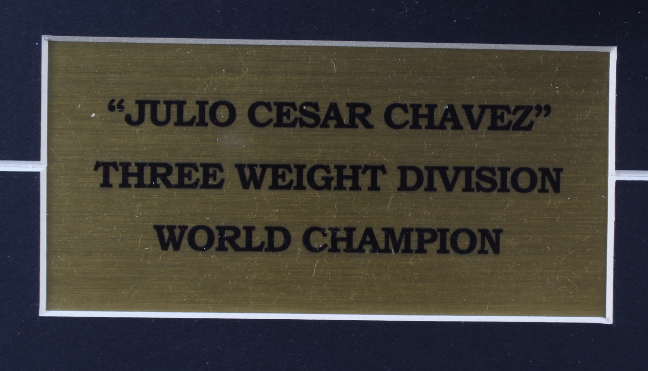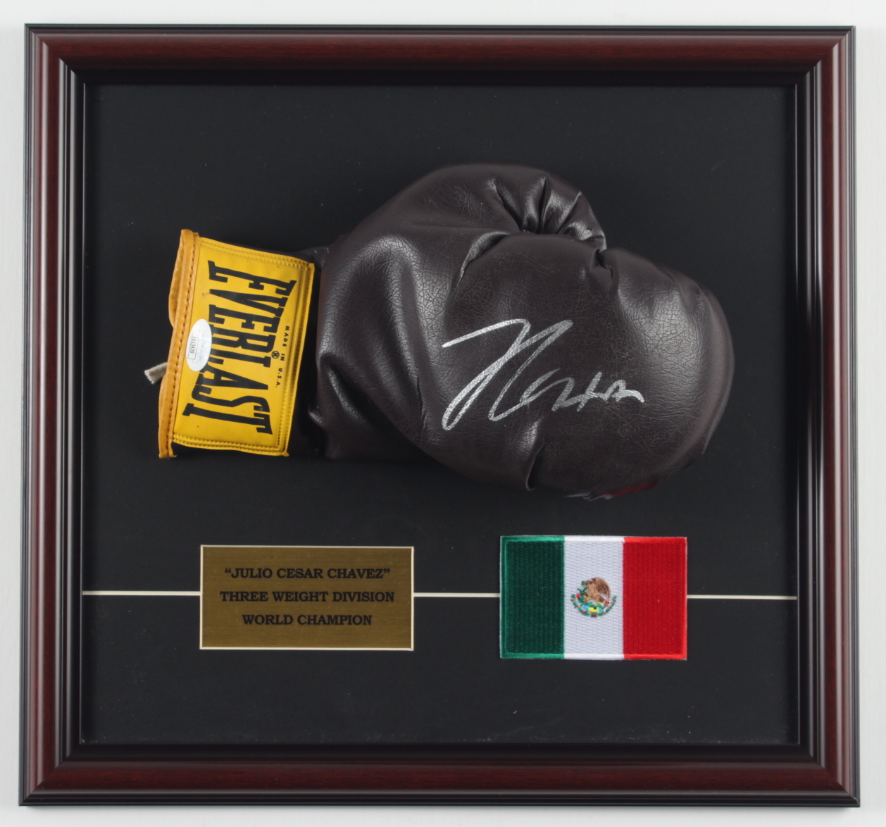 Custom frame measures 15" x 16" in size. Features a vintage Everlast boxing glove. Hand-signed by Julio Cesar Chavez (HOF).