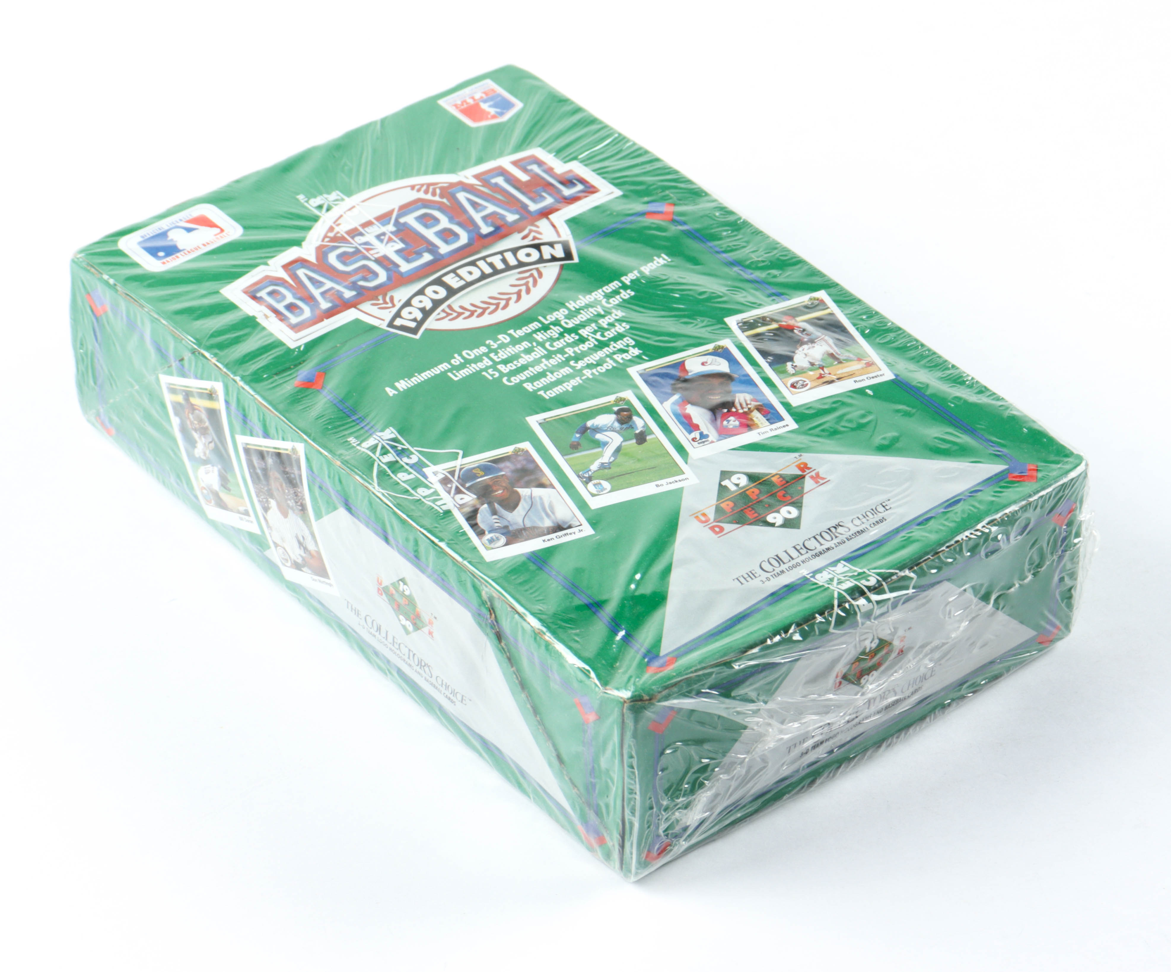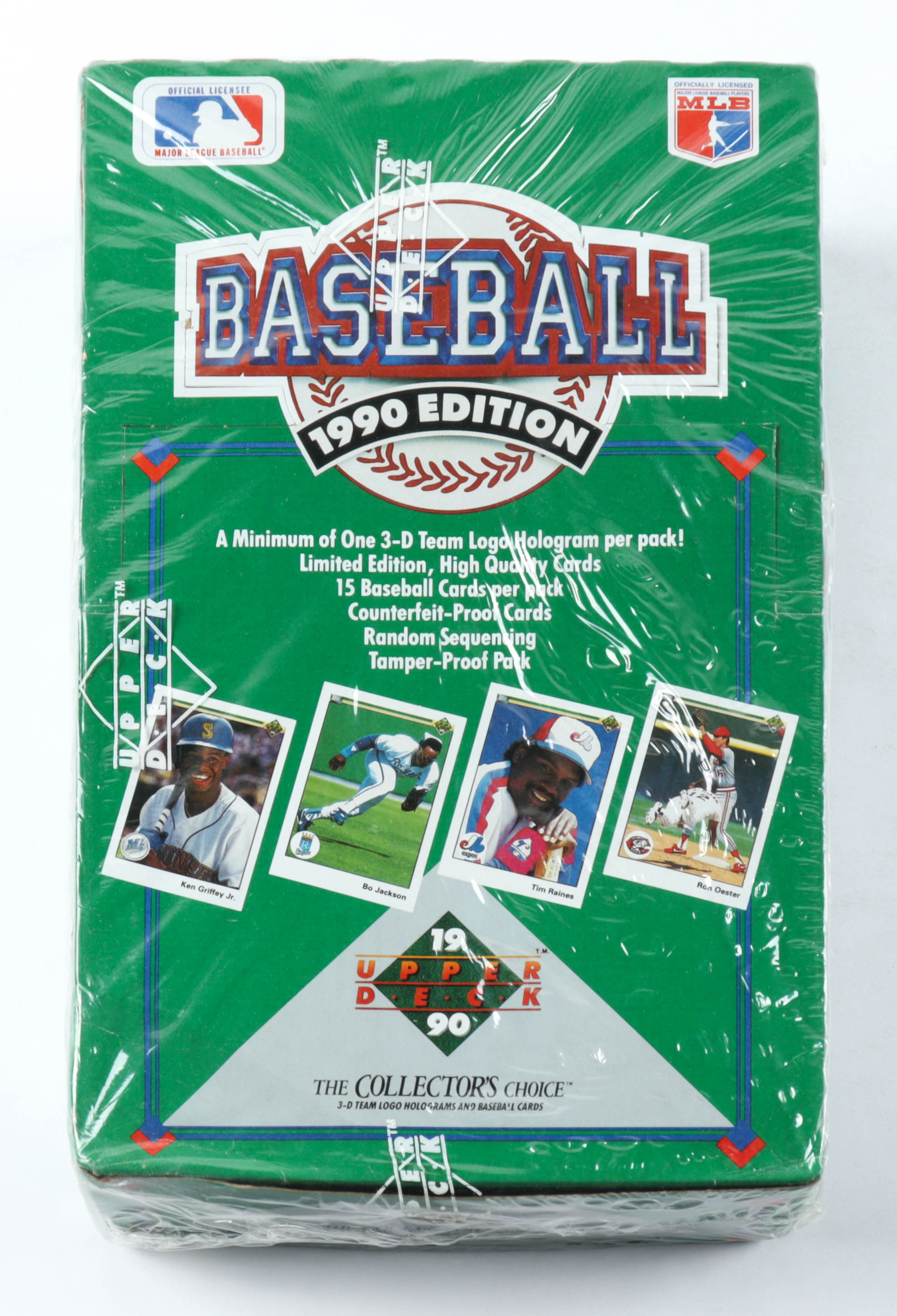 1990 Upper Deck Baseball Box. Each box is factory sealed and includes (36) wax foil packs with (15) cards per pack. That's 540 cards per box! Look for Sammy Sosa & Ken Griffey Jr. Possible cards include John Olerud RC, Sammy Sosa RC, Ken Griffey Jr. (2nd year), Kirby Puckett, Roger Clemens, Mike Schmidt, Robin Yount, George Brett, Ryne Sandberg, Tony Gwynn, Don Mattingly, Pete Rose, Cal Ripken Jr, Nolan Ryan, Randy Johnson, Craig Biggio, and more. Please see photos for details regarding the condition of the box.