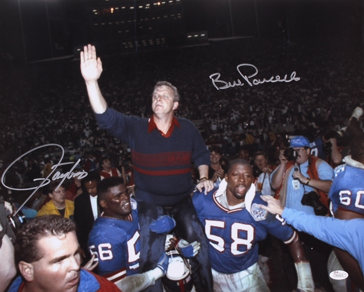 Photo measures 16" x 20" in size and is hand-signed in silver paint pen by Lawrence Taylor (Giants HOF) and Bill Parcells (HOF).